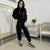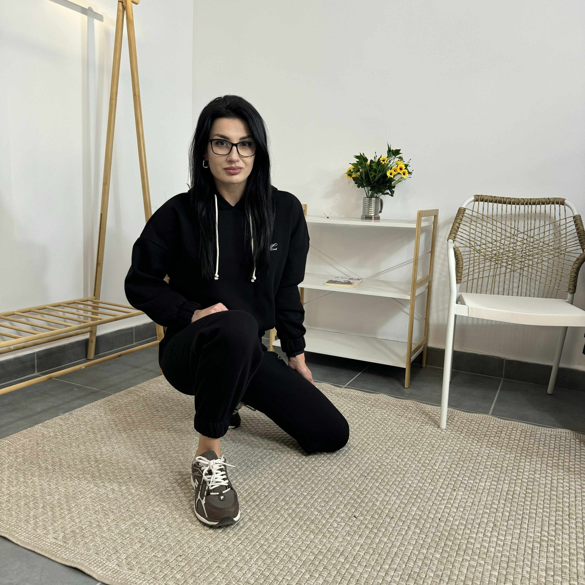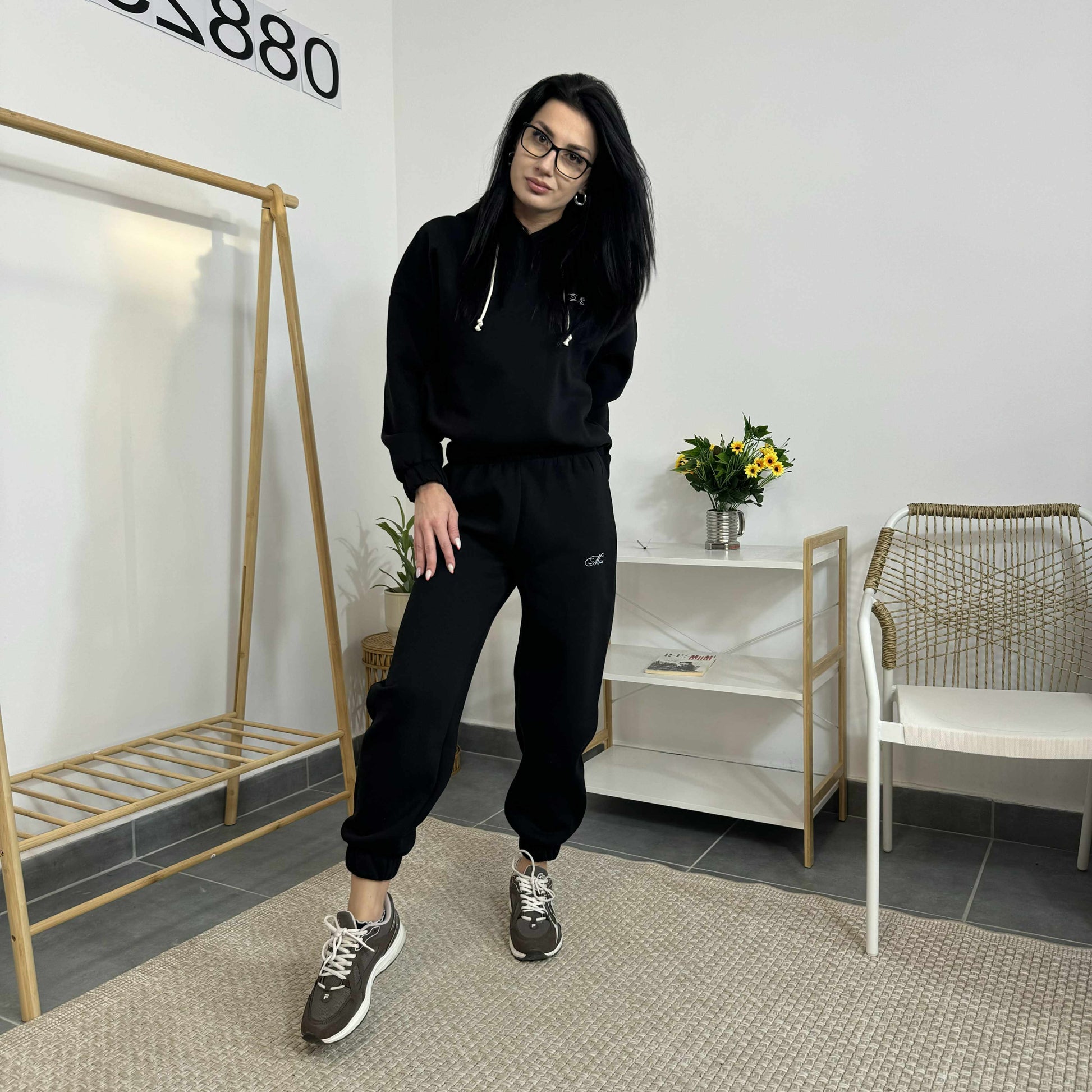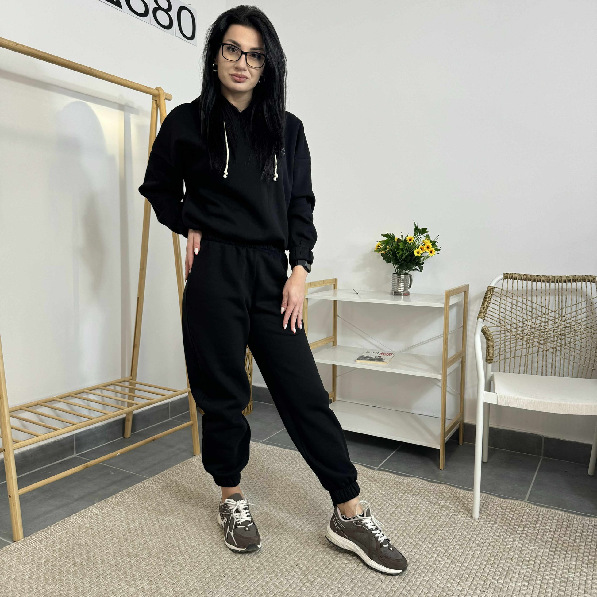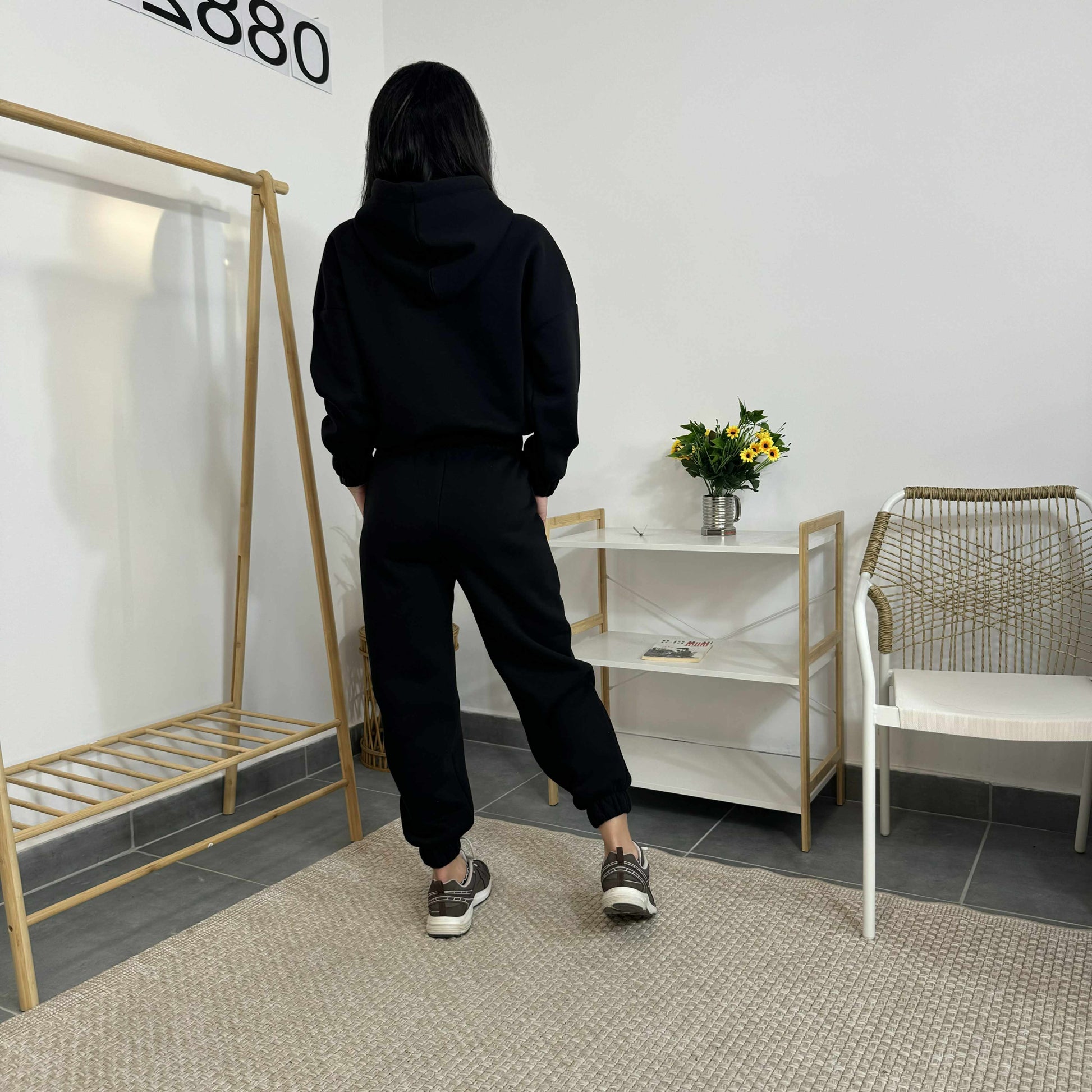 Този дамски спортен комплект в черен цвят съчетава комфорт и модерна визия. Изработен е от висококачествена българска памучна материя с еластан, която осигурява мекота, топлина и свобода на движение.