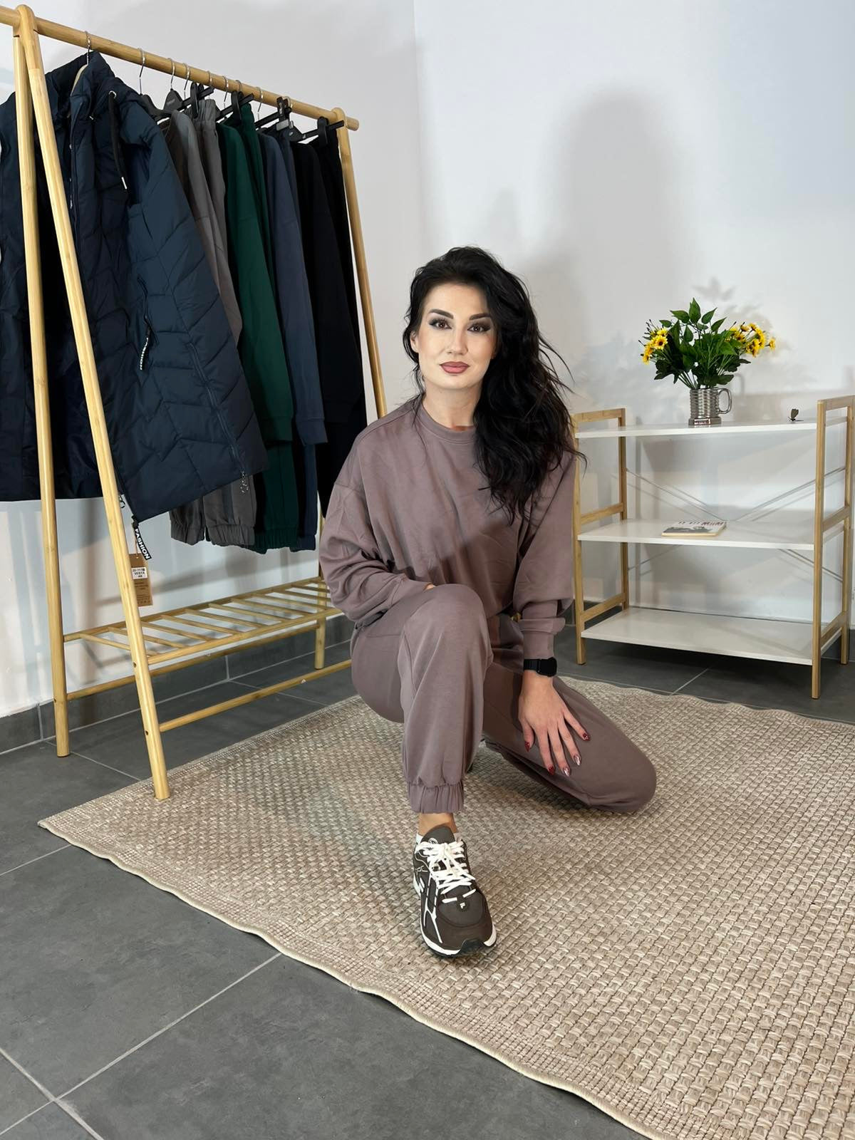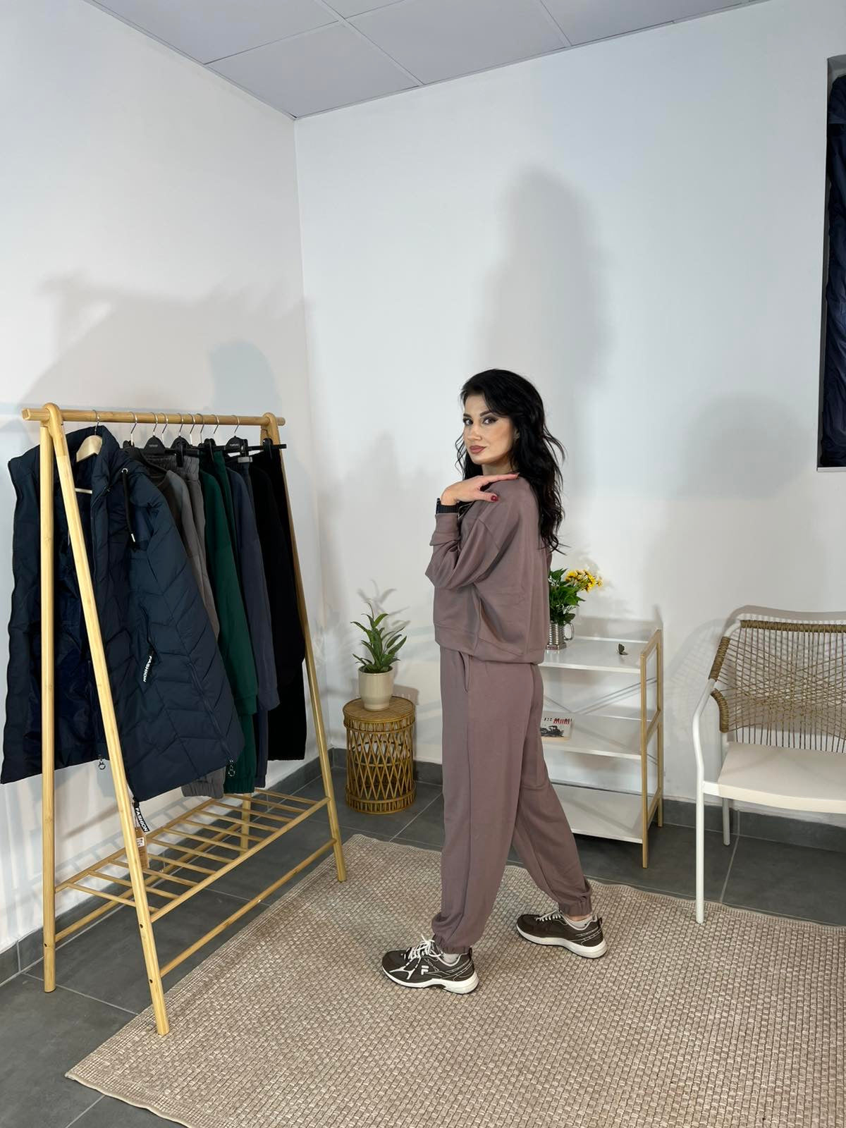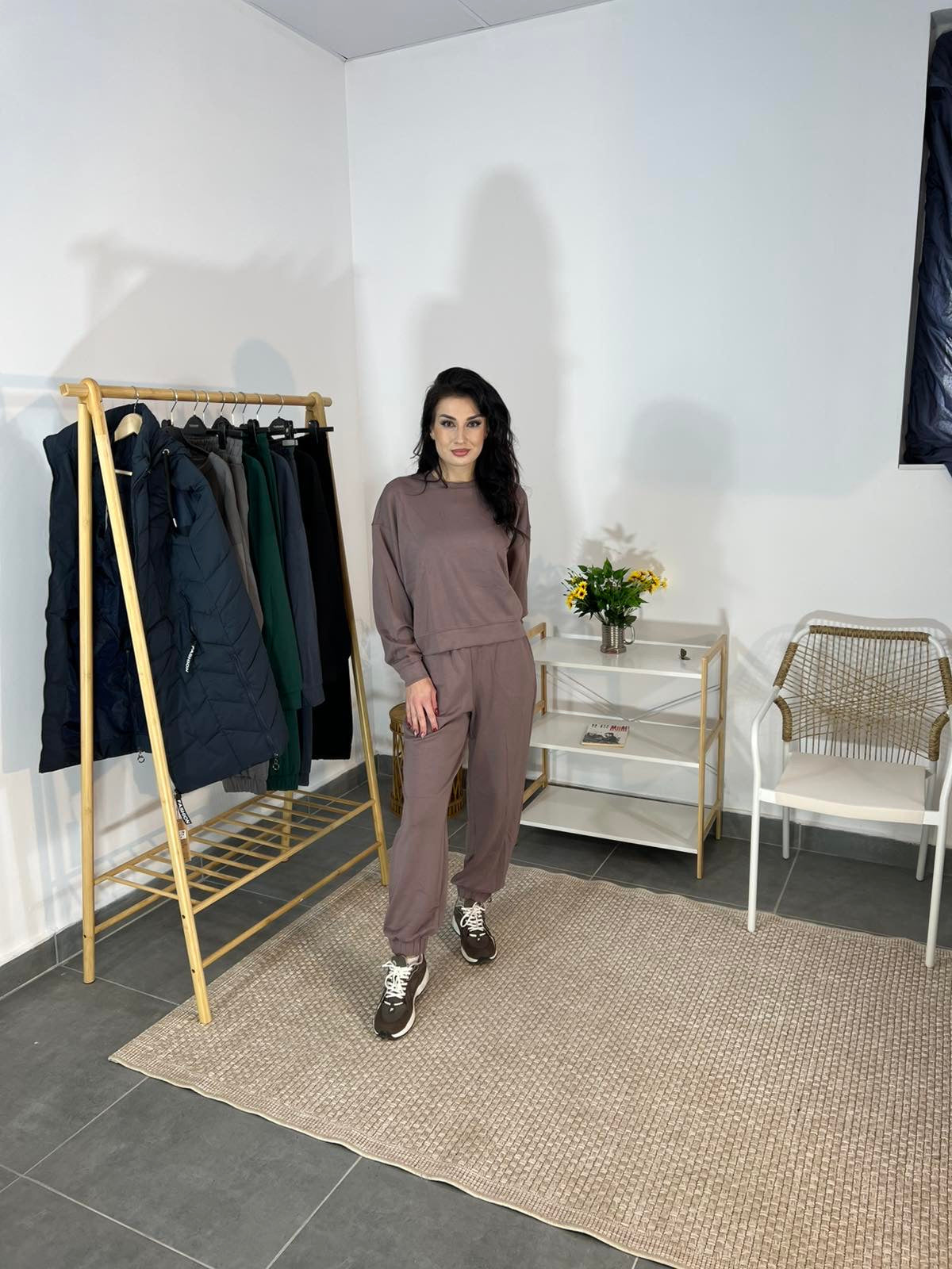 Горнището с обло деколте и изчистена линия придава елегантен силует, а панталонът със съвършена кройка осигурява свобода на движение и удобство. Това е комплект, който ще обикнете – подходящ както за разходки, така и за ежедневни срещи или уют у дома.