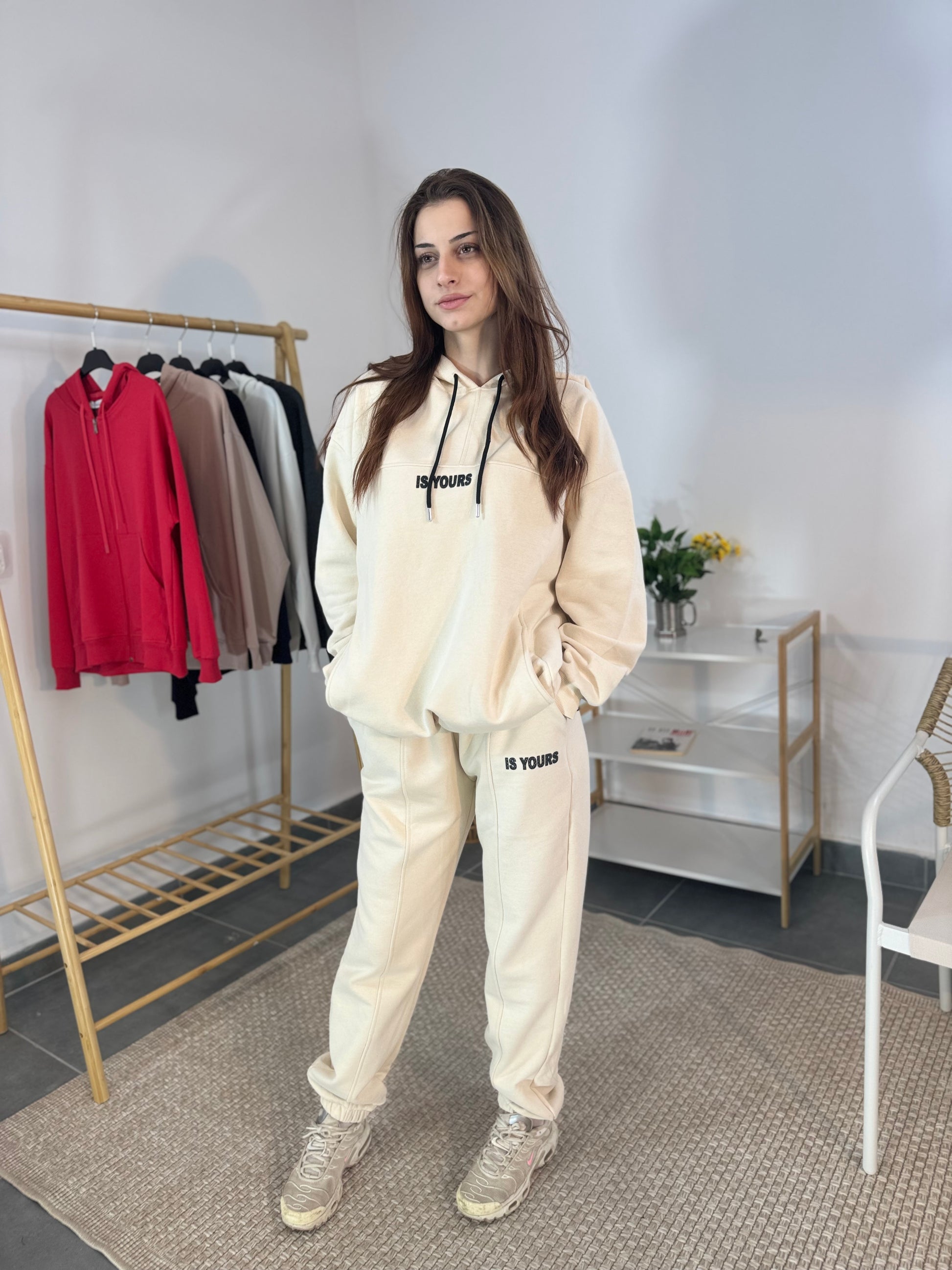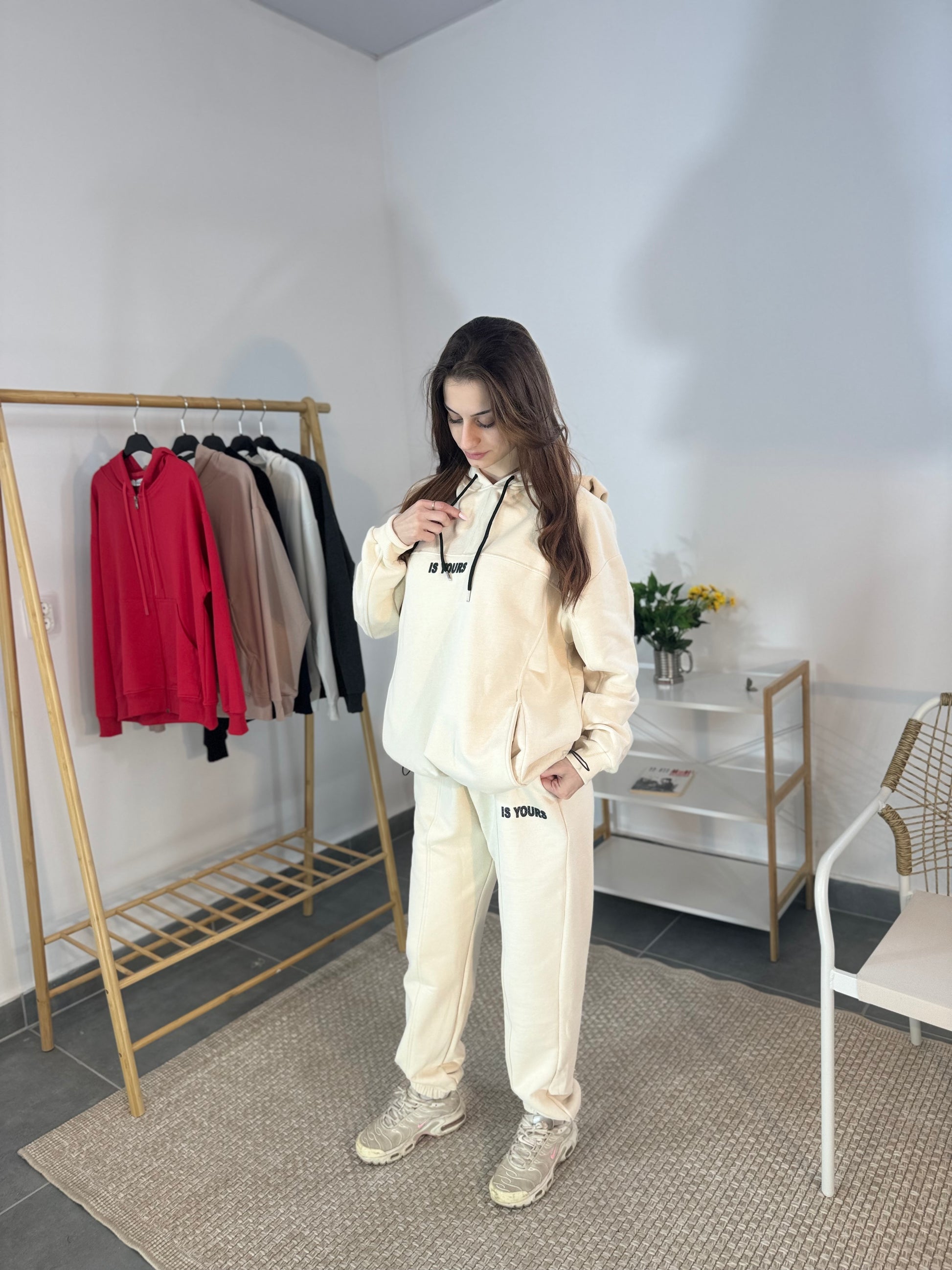 Горнището с качулка и щампа придава модерен и енергичен вид, докато панталонът с идеална кройка осигурява свобода на движение и комфорт през целия ден. Независимо дали си в града, на разходка или пътуваш, този комплект ще бъде твоята втора кожа.