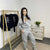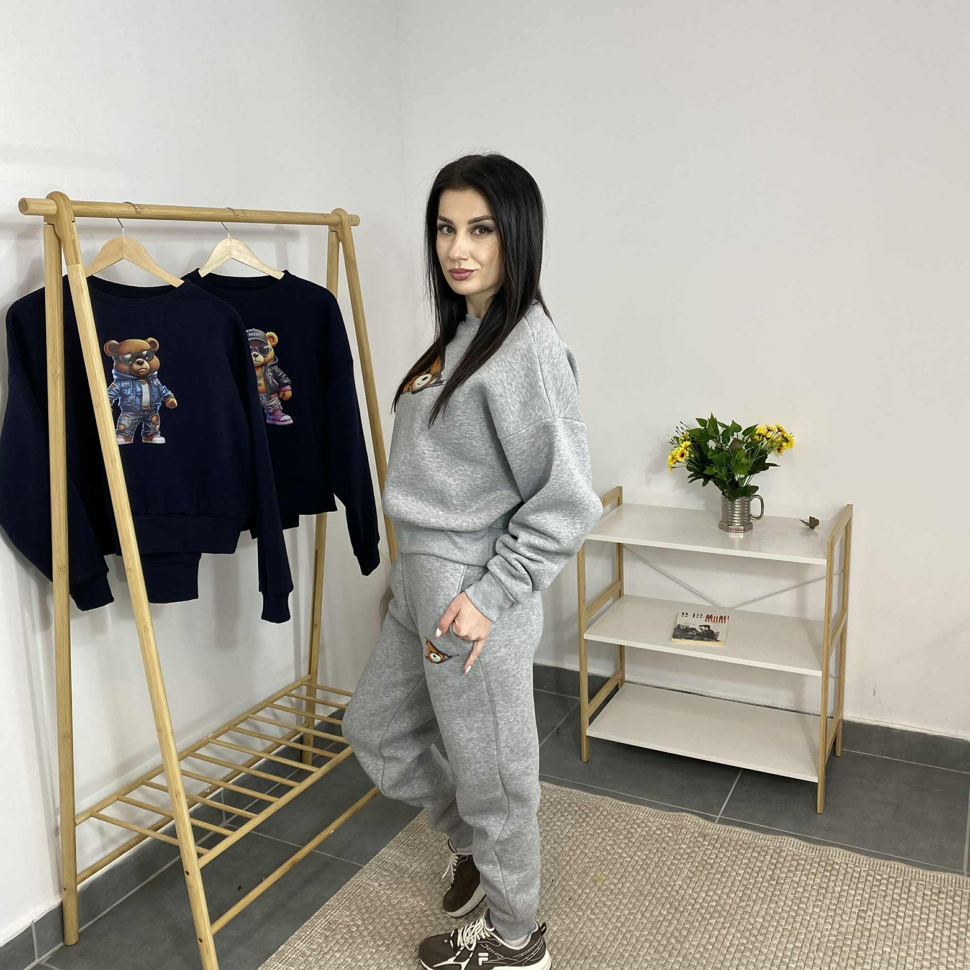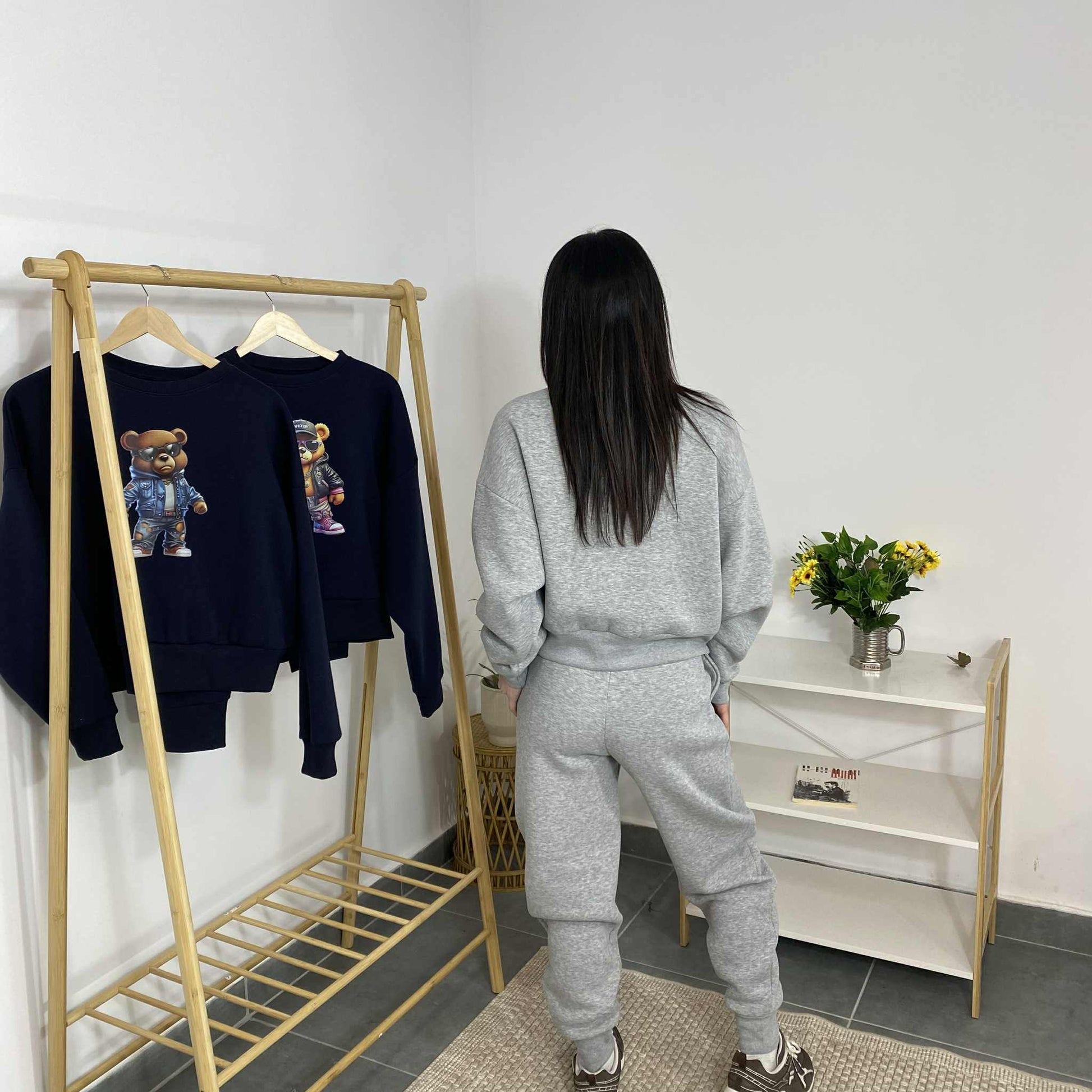 Декориран е с ефектен принт на мечок с дънково яке – свеж акцент, който придава настроение и индивидуалност. Горнището е с удобна ластична талия и маншети, а долнището – с ластик в кръста и глезените.