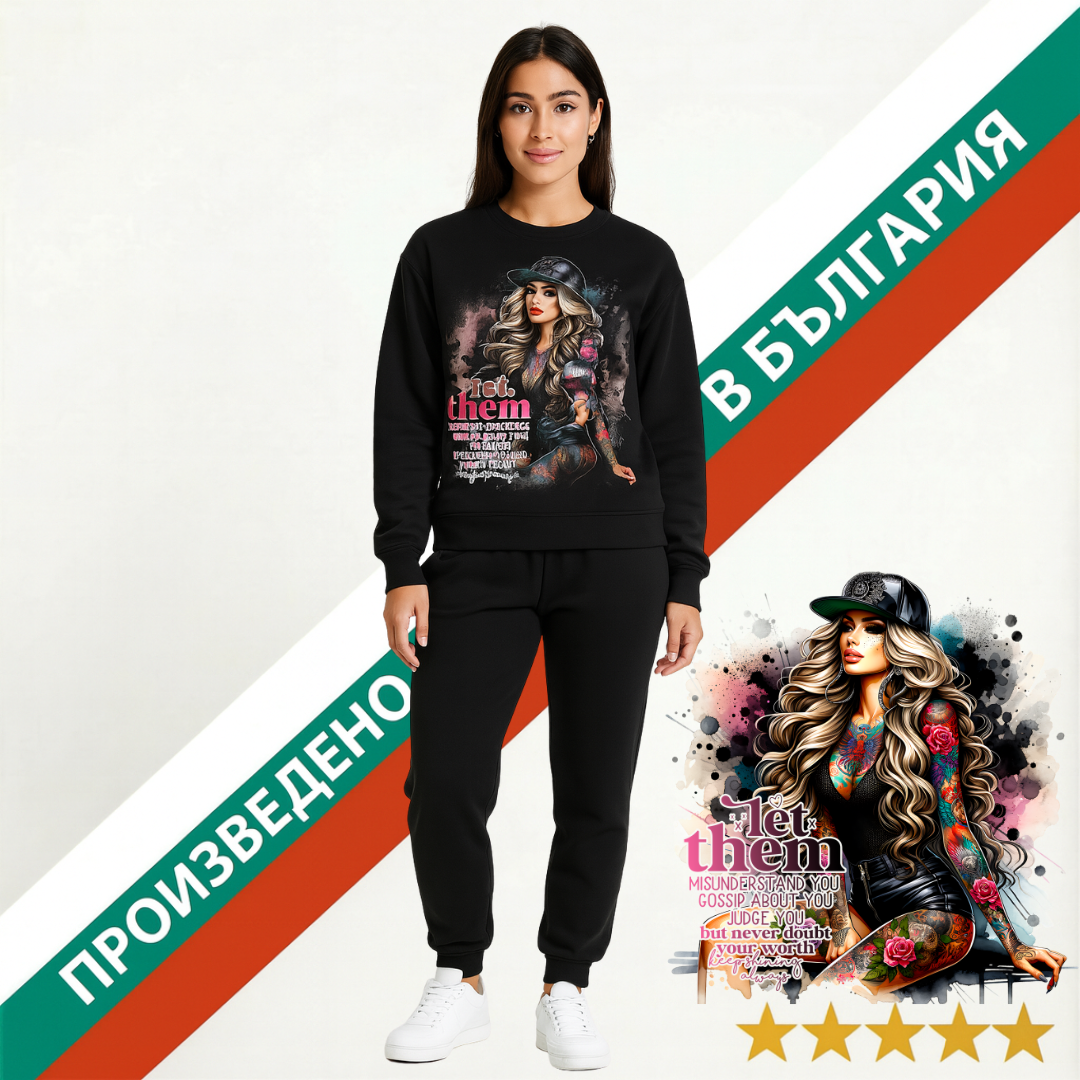 Този дамски спортен комплект съчетава комфорт и модерна визия. Изработен е от висококачествена българска памучна материя с еластан, която осигурява мекота, топлина и свобода на движение.