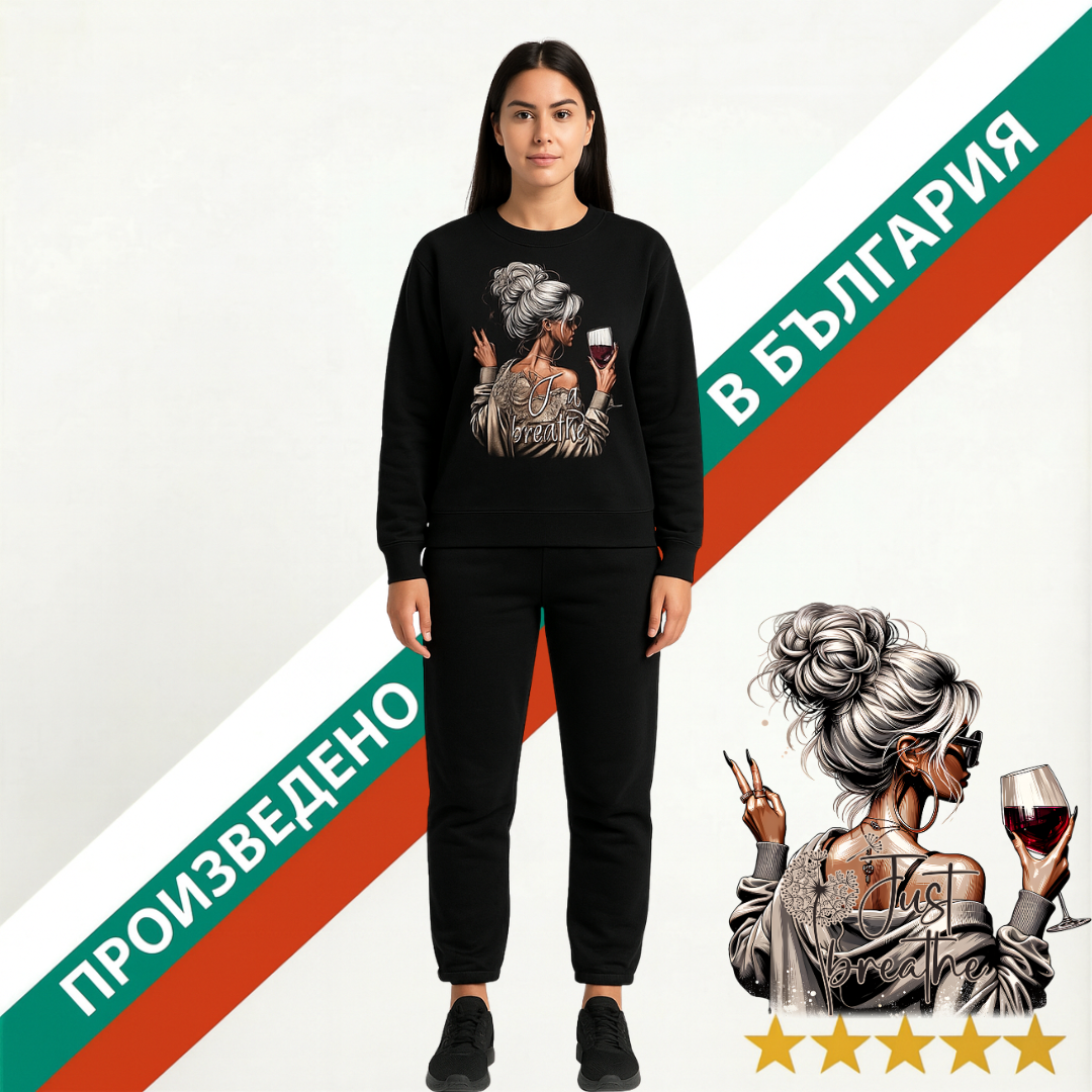 Този дамски спортен комплект съчетава комфорт и модерна визия. Изработен е от висококачествена българска памучна материя с еластан, която осигурява мекота, топлина и свобода на движение.