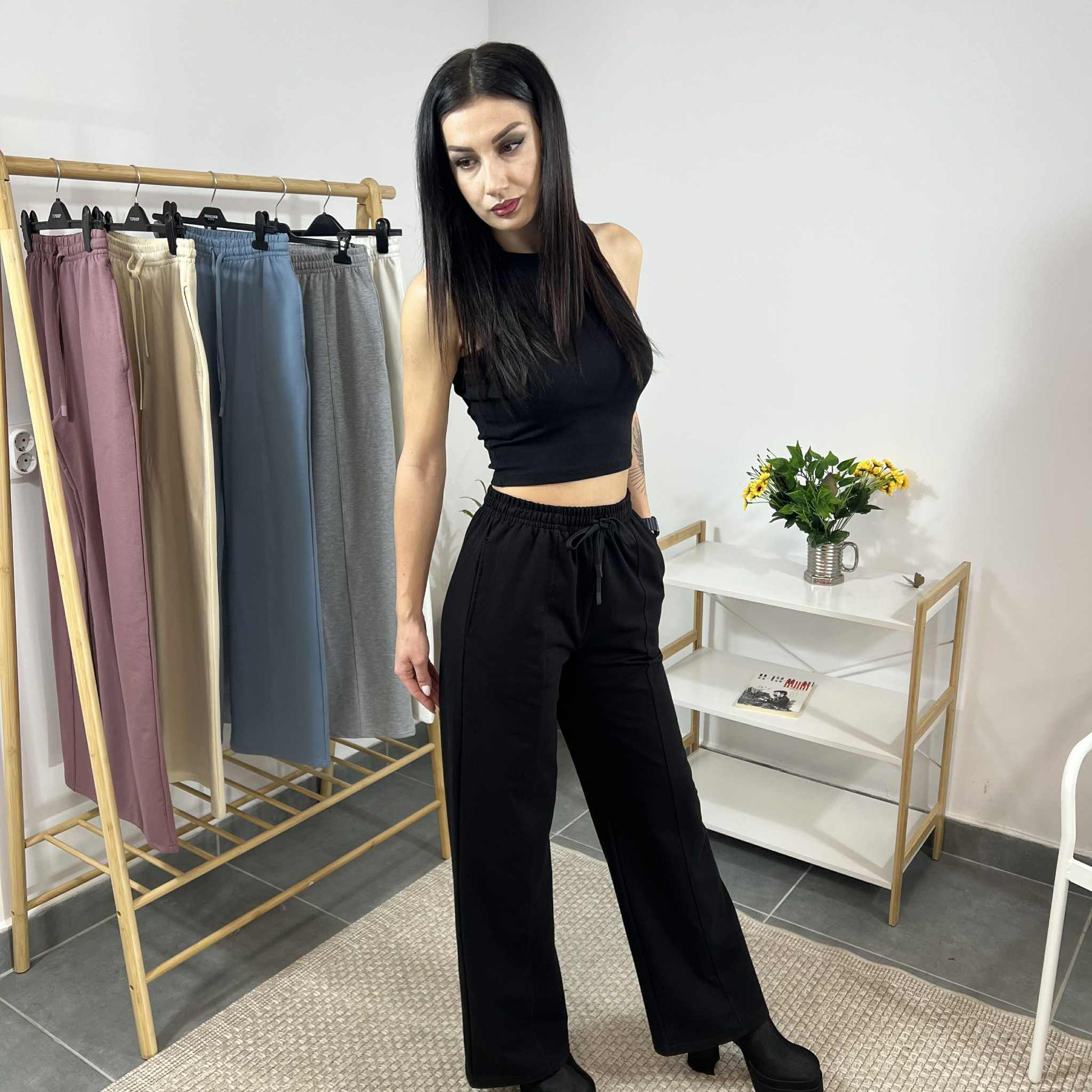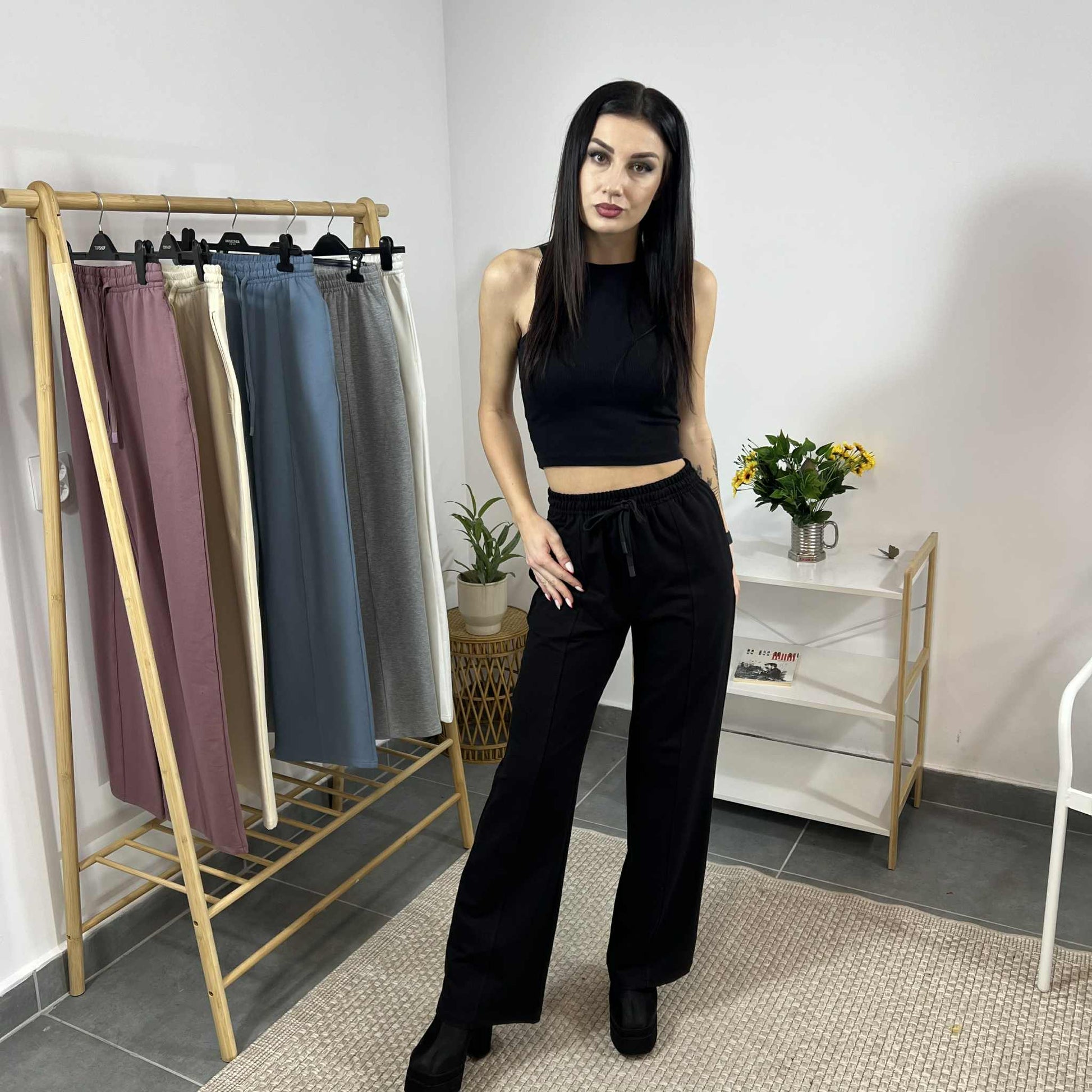 Свободната кройка с дълъг и широк крачол придава модерен силует, който издължава фигурата и осигурява максимално удобство през целия ден. Перфектен за разходки, пътувания или релакс, като същевременно изглежда стилно и съвременно.