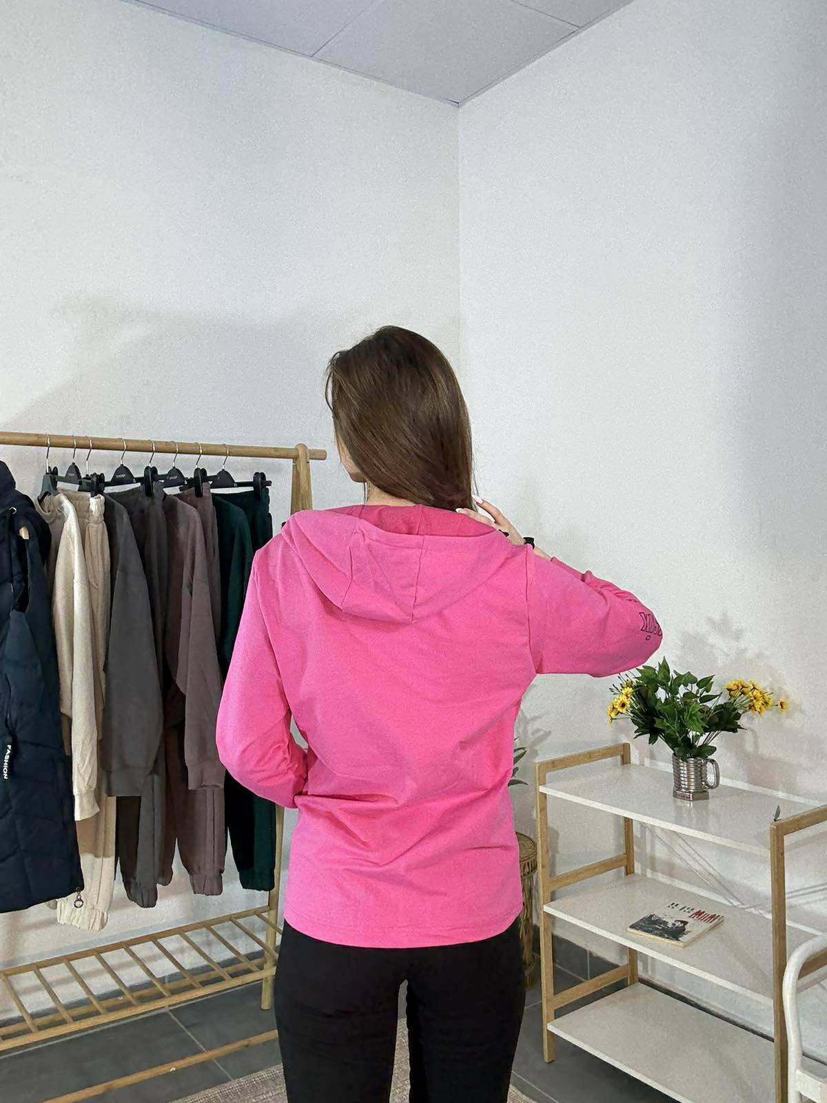 Комплектът включва удобно горнище с дълъг ръкав и долнище с еластична талия, които осигуряват свобода на движение и подчертават спортно-елегантния стил. Идеален е за ежедневие, разходки и спорт.