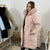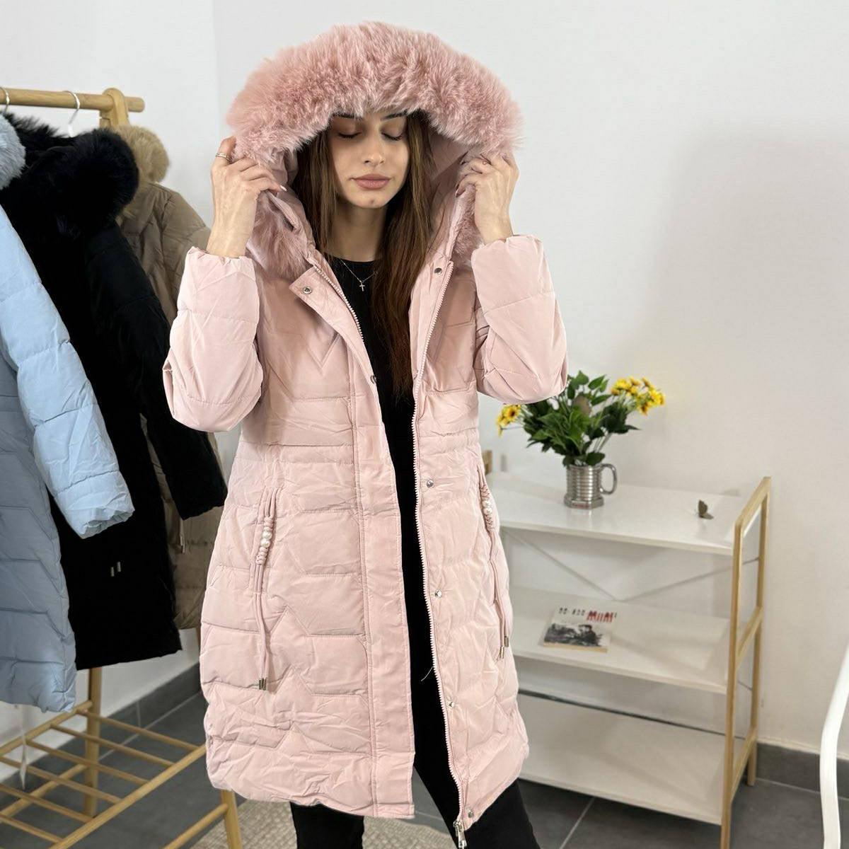 Дълго дамско зимно яке с качулка и пух – Пудра