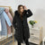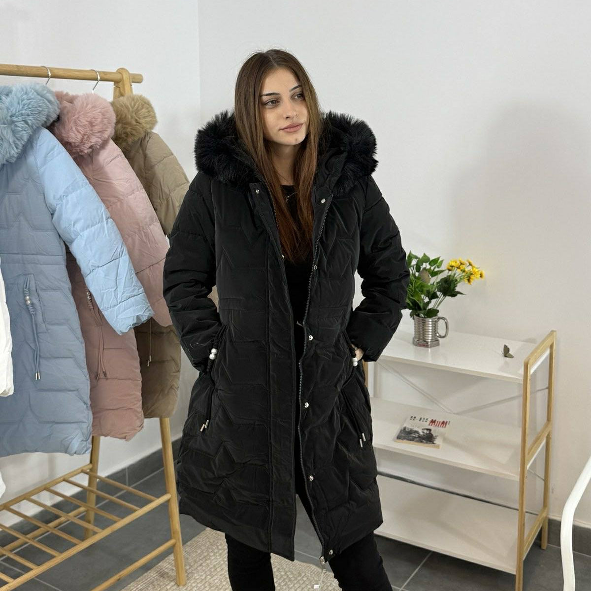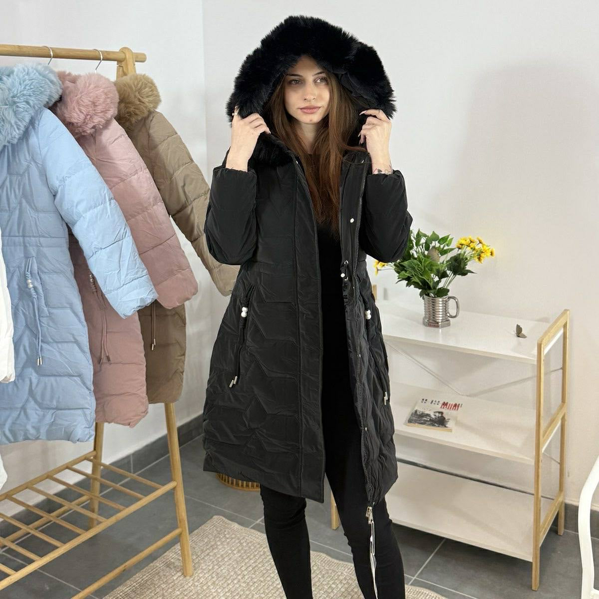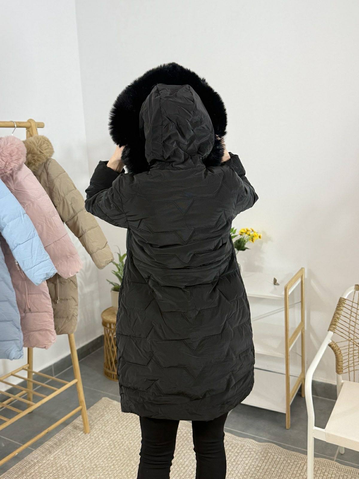 Дълго дамско зимно яке с качулка и пух – черно