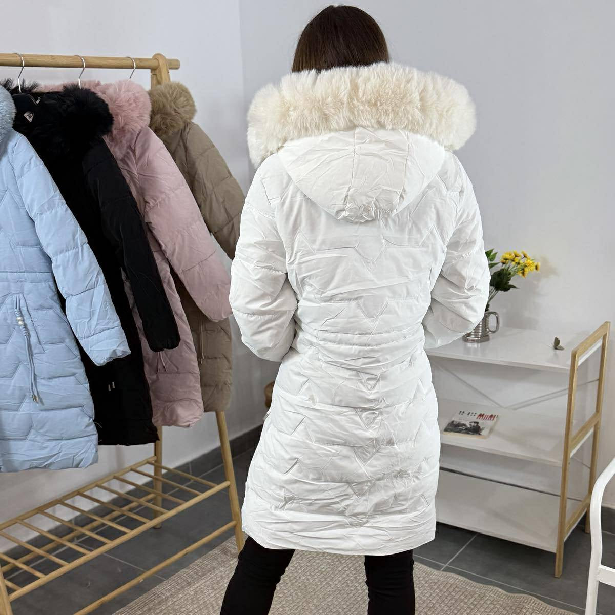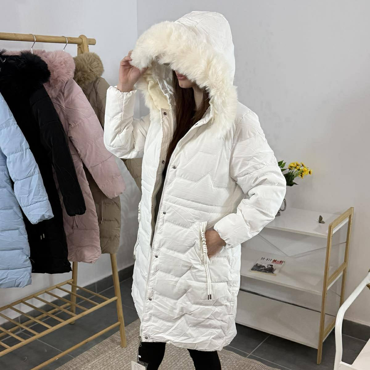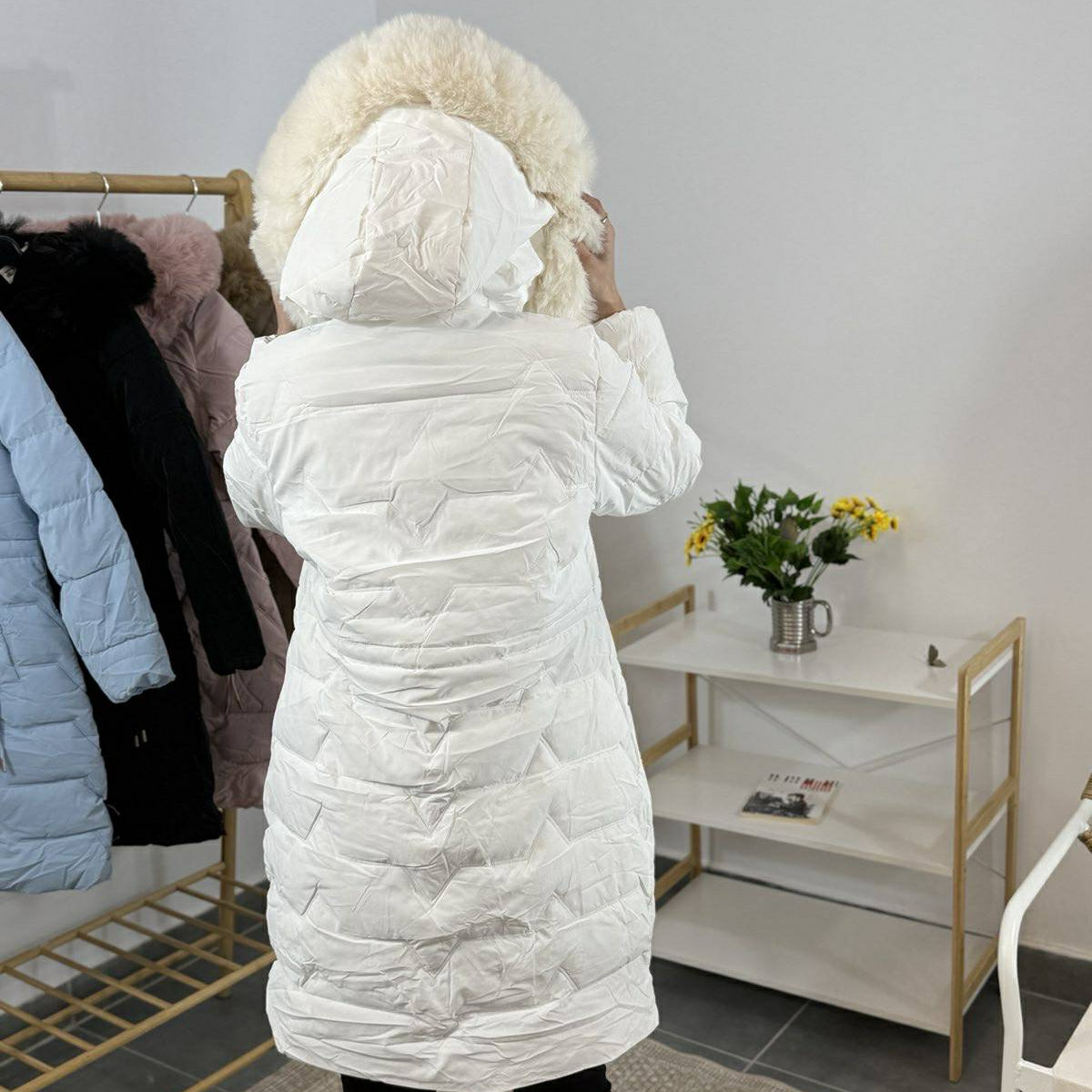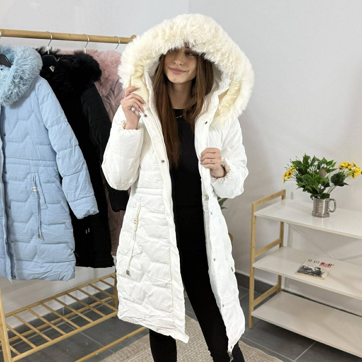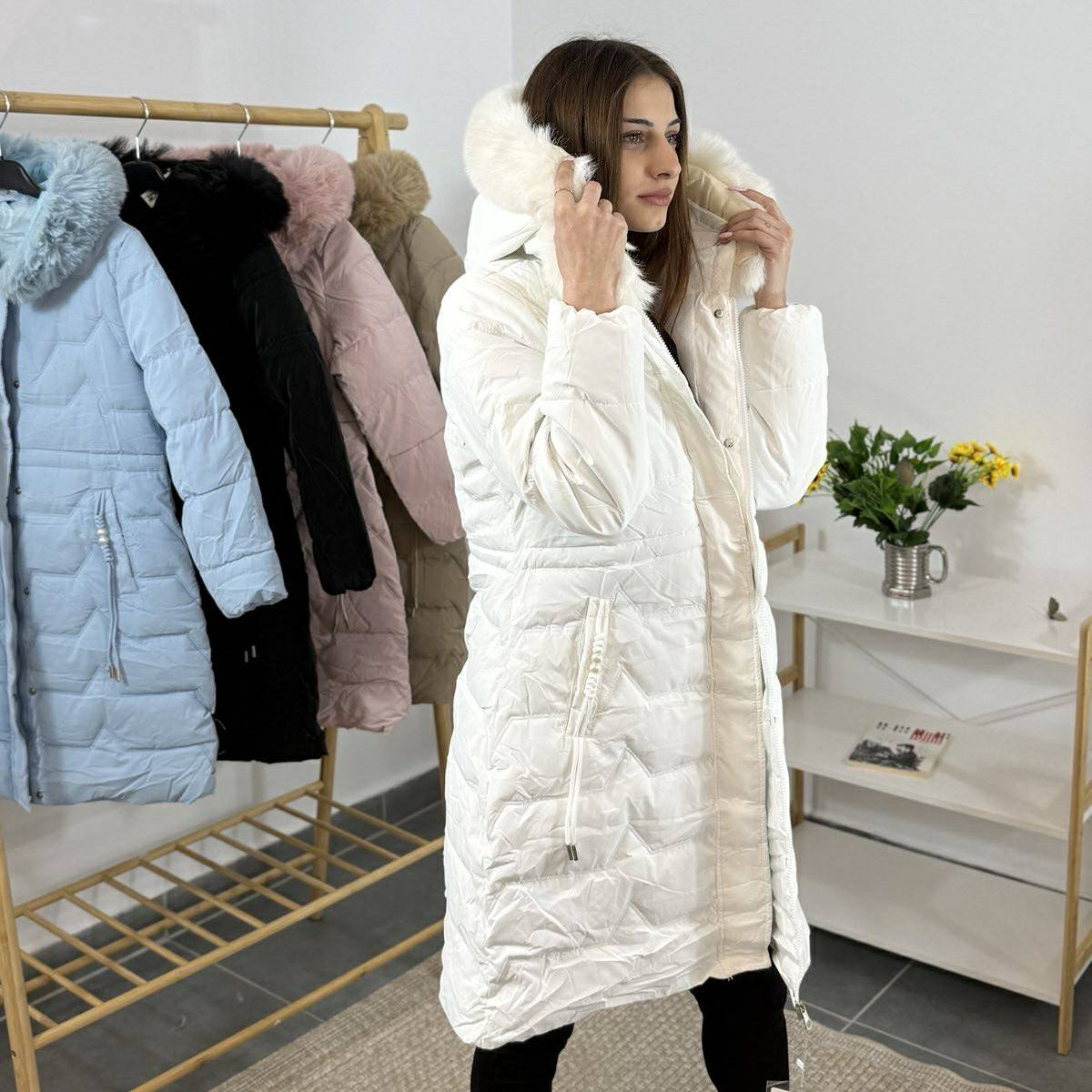 Луксозно дълго зимно яке в елегантен бял цвят, съчетаващо комфорт, топлина и изискан стил. Моделът е с леко втален силует и регулируема връзка в талията, която подчертава фигурата. Качулката е обточена с пух за по-мек и топъл ефект, като добавя модерен акцент към визията. Якето се закопчава с цип и има странични джобове с връзки и декоративни детайли.