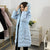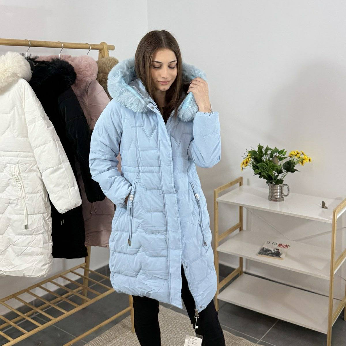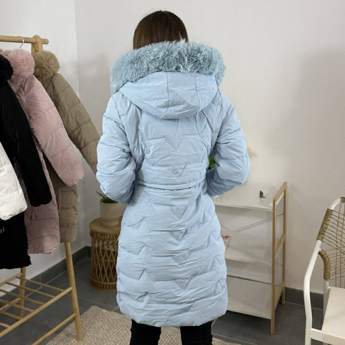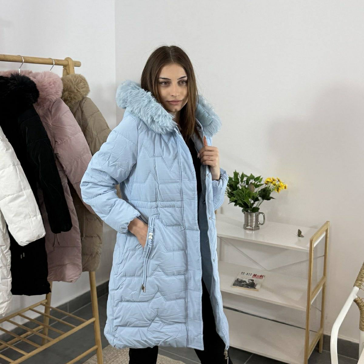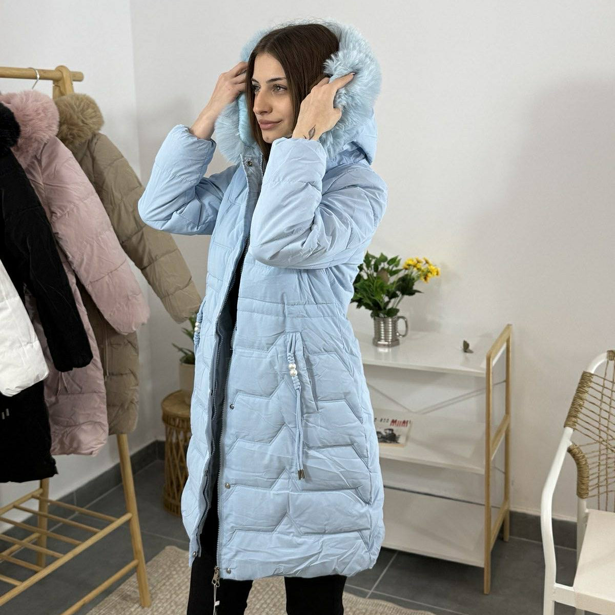 Дълго дамско зимно яке с качулка и пух – синьо небе