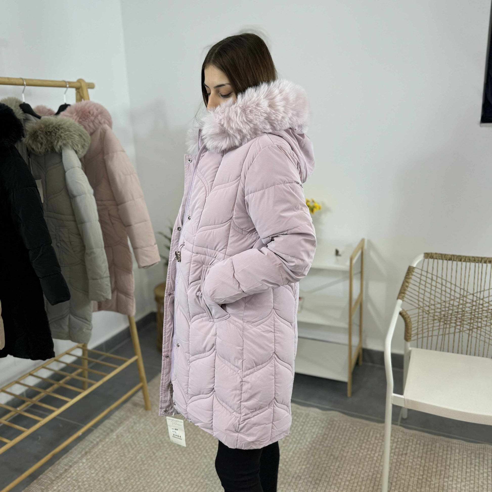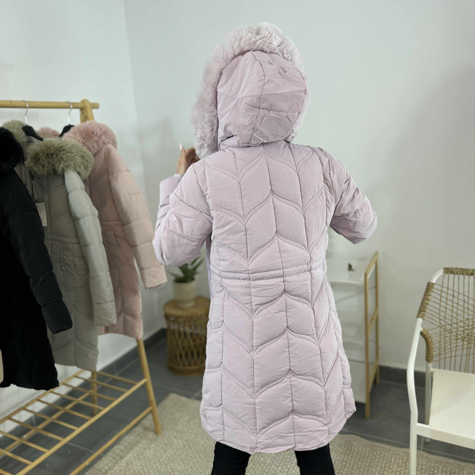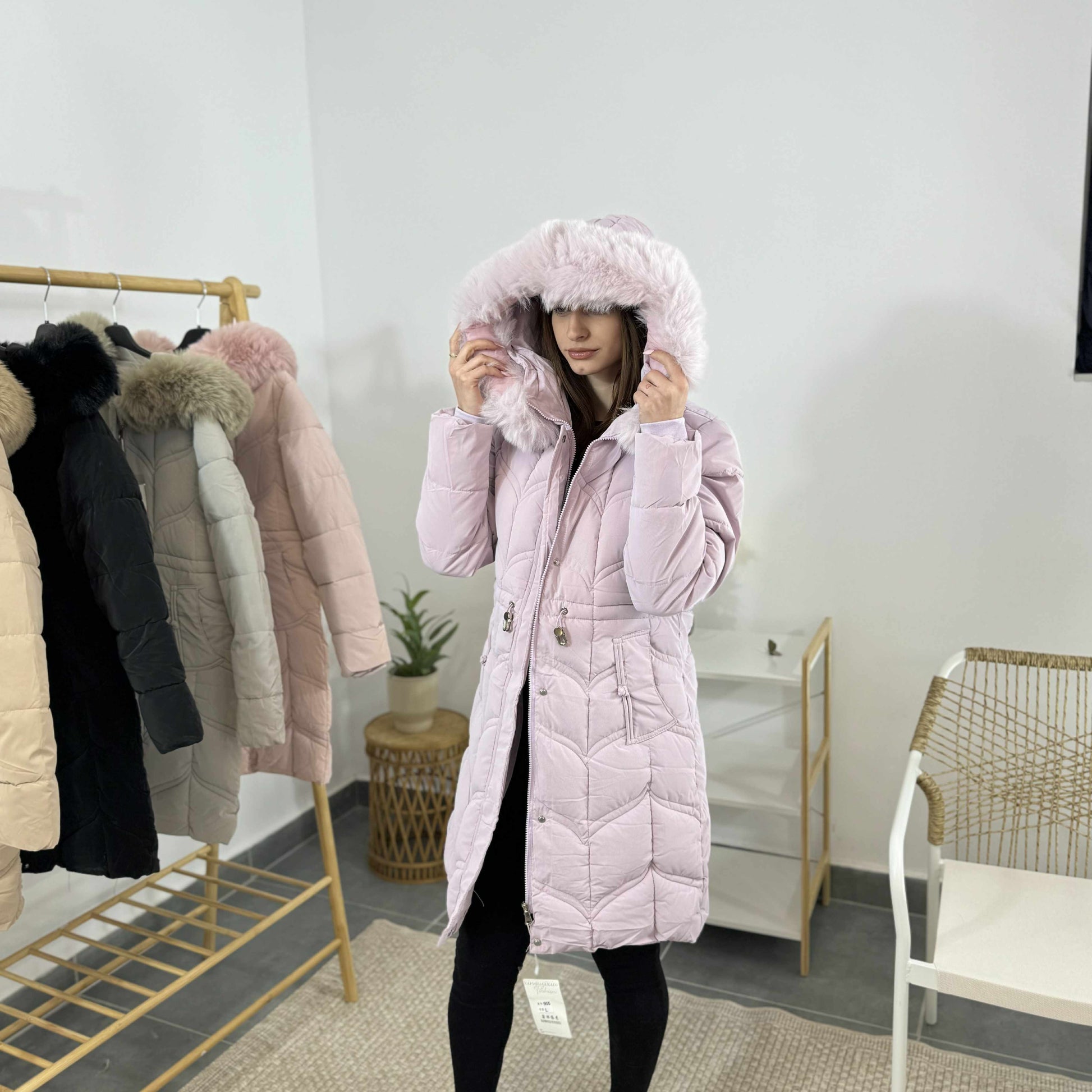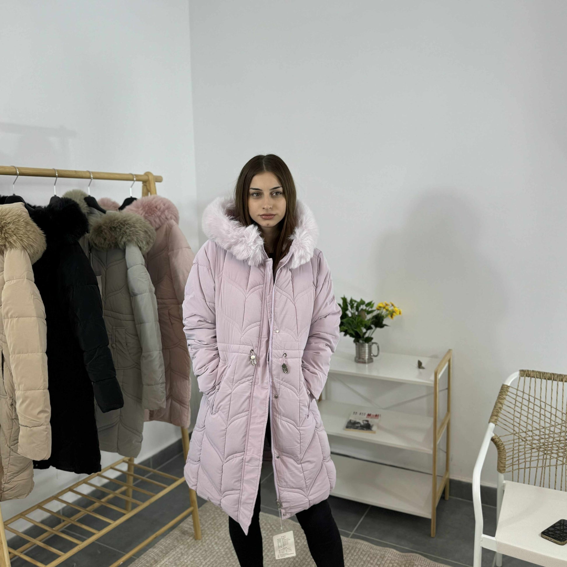 Добави нежност и стил към зимната си визия с това модерно дамско яке в нежен пудра розов цвят. Моделът впечатлява с елегантна капитонирана шарка и пухкава качулка, която съчетава топлина и лукс. Изработено от висококачествена материя, якато предпазва от студ и вятър, якето осигурява максимален комфорт през студените дни.