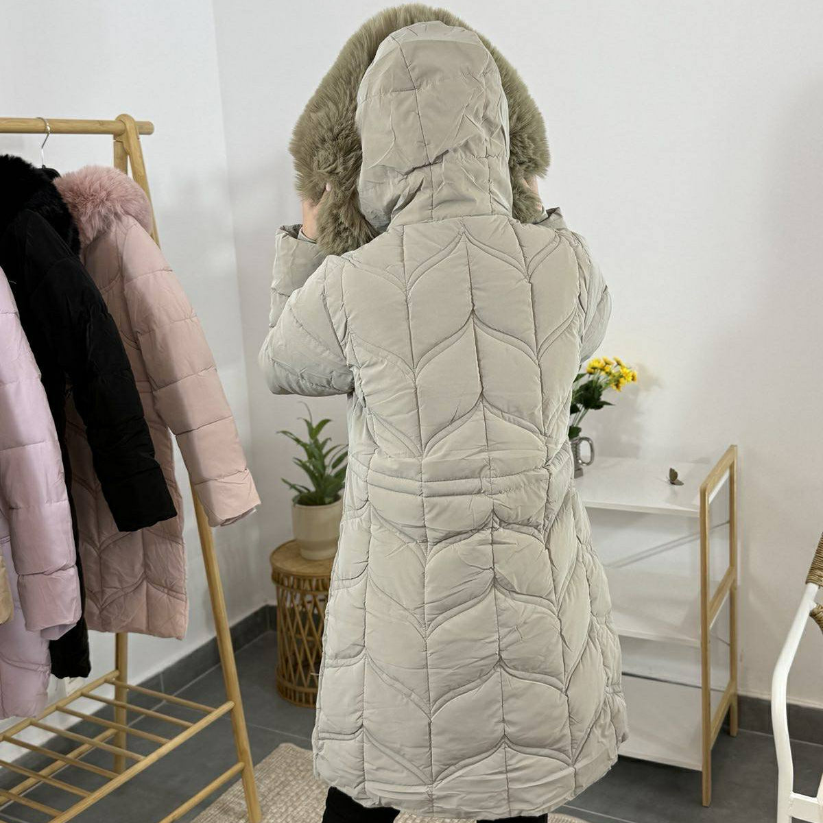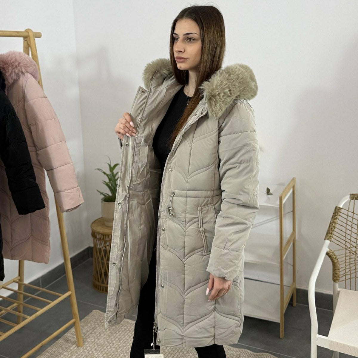 Добави нежност и стил към зимната си визия с това модерно дамско яке в нежен пудра розов цвят. Моделът впечатлява с елегантна капитонирана шарка и пухкава качулка, която съчетава топлина и лукс. Изработено от висококачествена материя, якато предпазва от студ и вятър, якето осигурява максимален комфорт през студените дни.