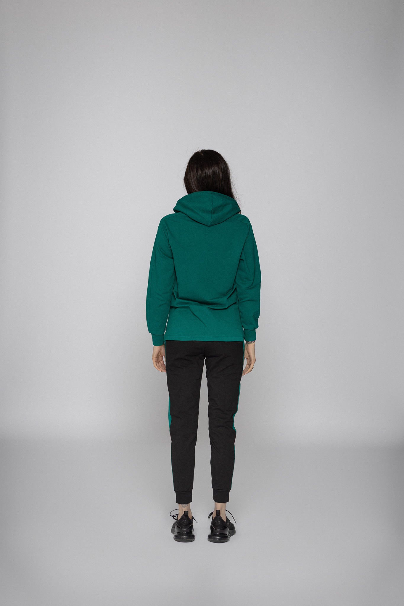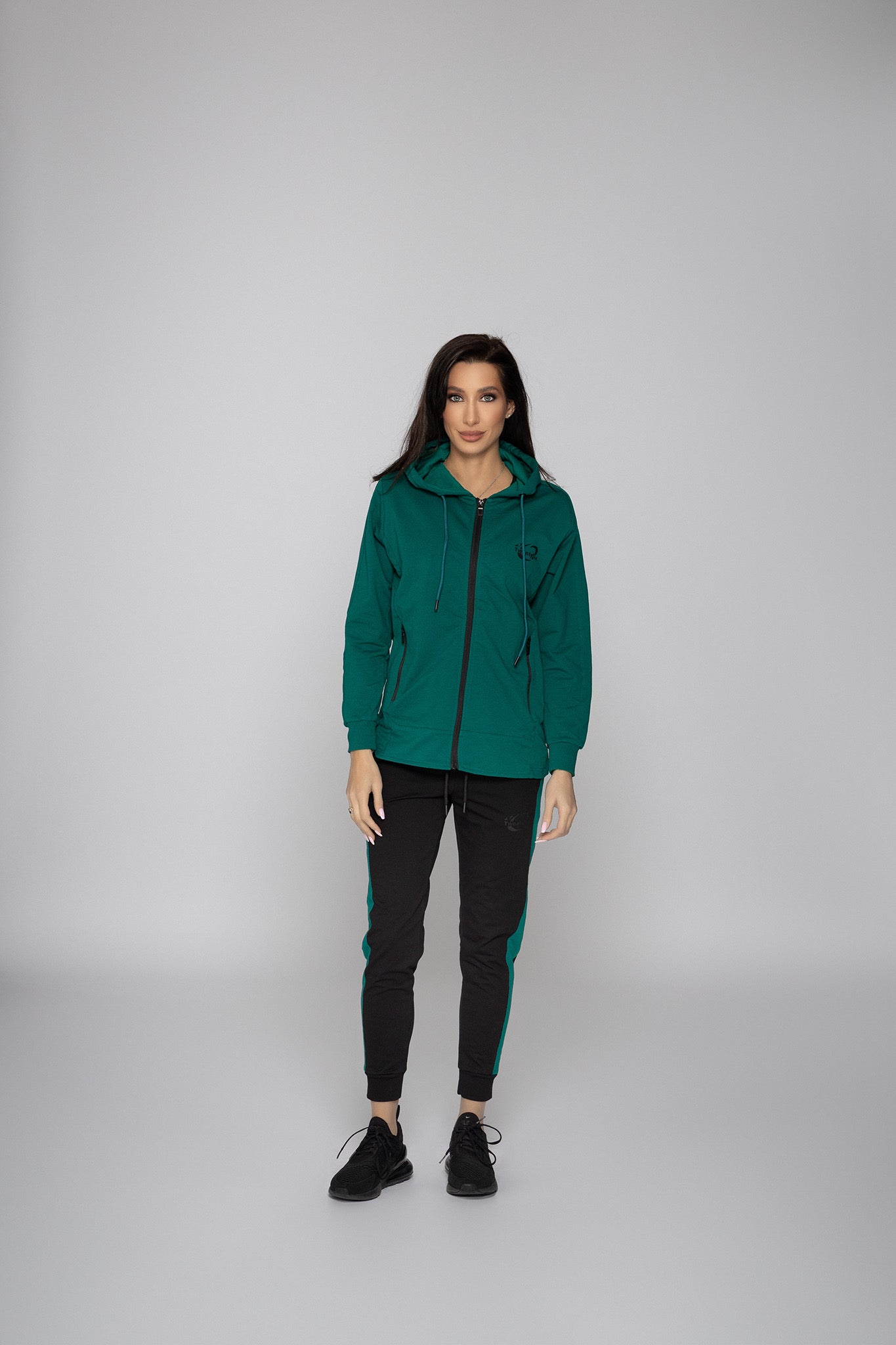 Комплектът включва удобно горнище с дълъг ръкав и долнище с еластична талия, които осигуряват свобода на движение и подчертават спортно-елегантния стил. Идеален е за ежедневие, разходки и спорт.