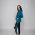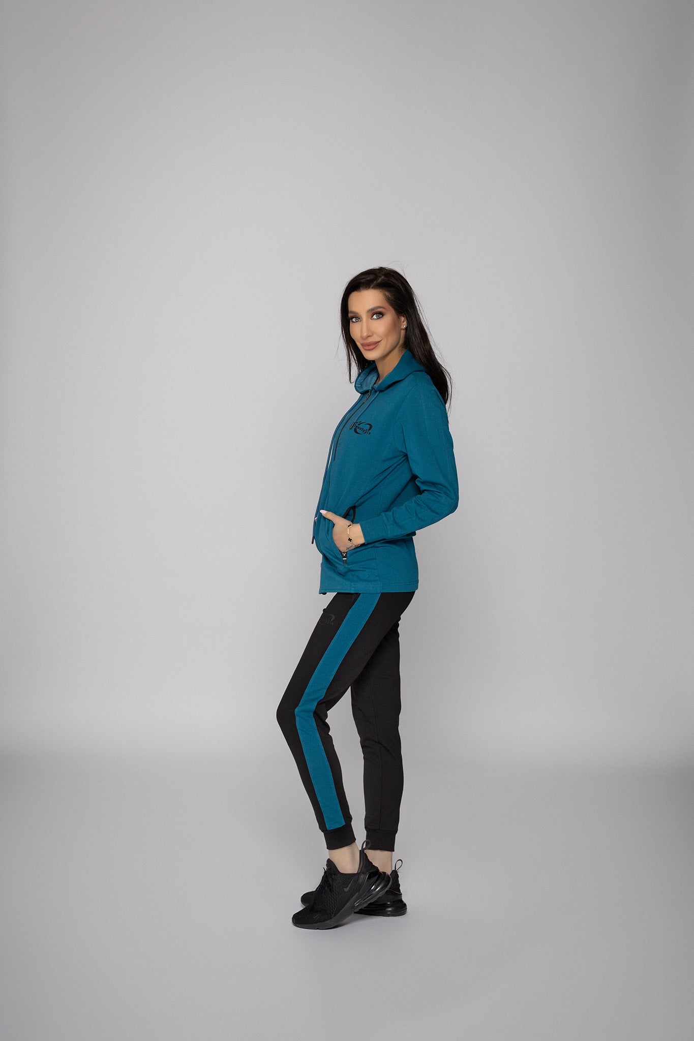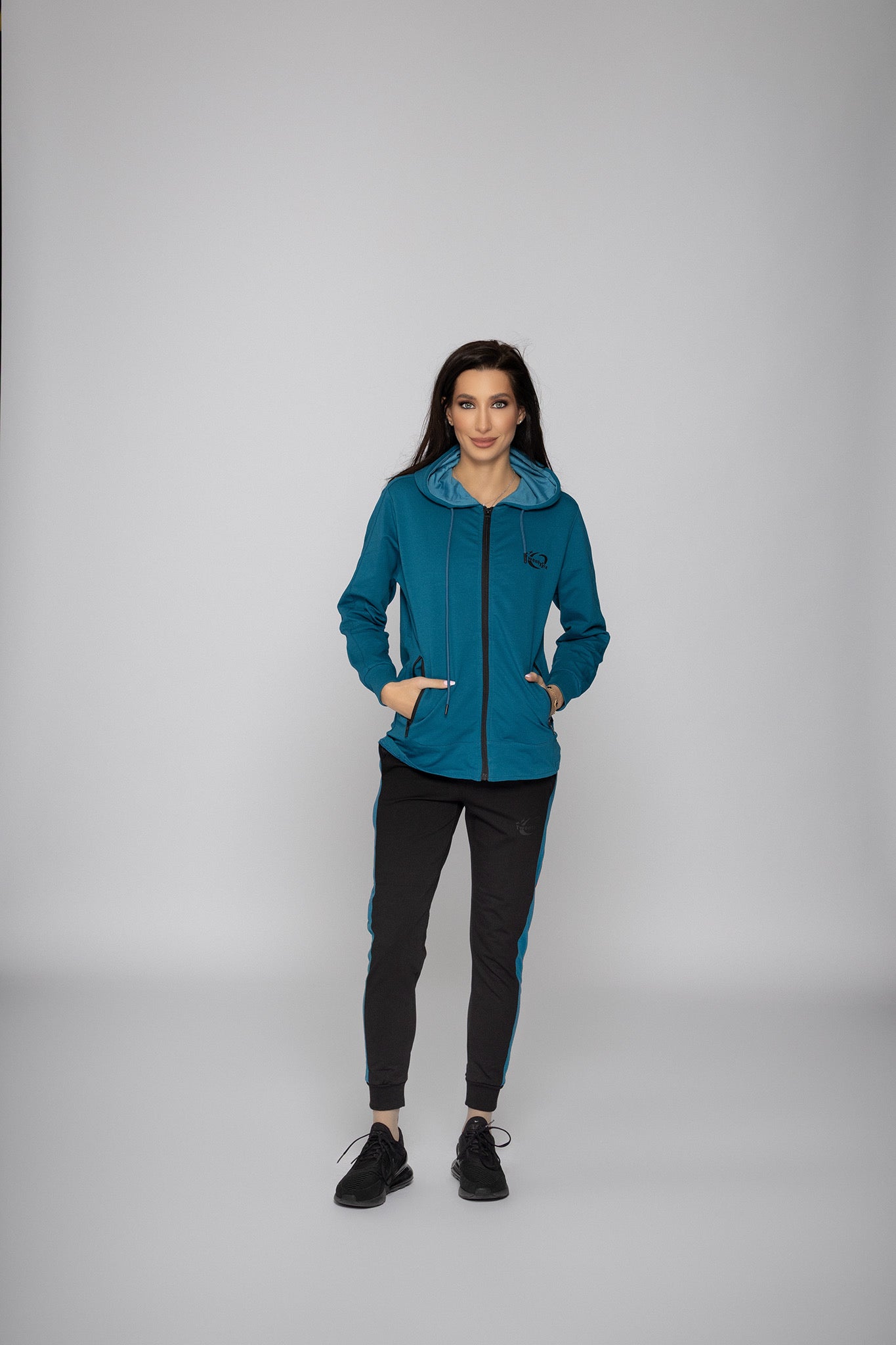 Комплектът включва удобно горнище с дълъг ръкав и долнище с еластична талия, които осигуряват свобода на движение и подчертават спортно-елегантния стил. Идеален е за ежедневие, разходки и спорт.