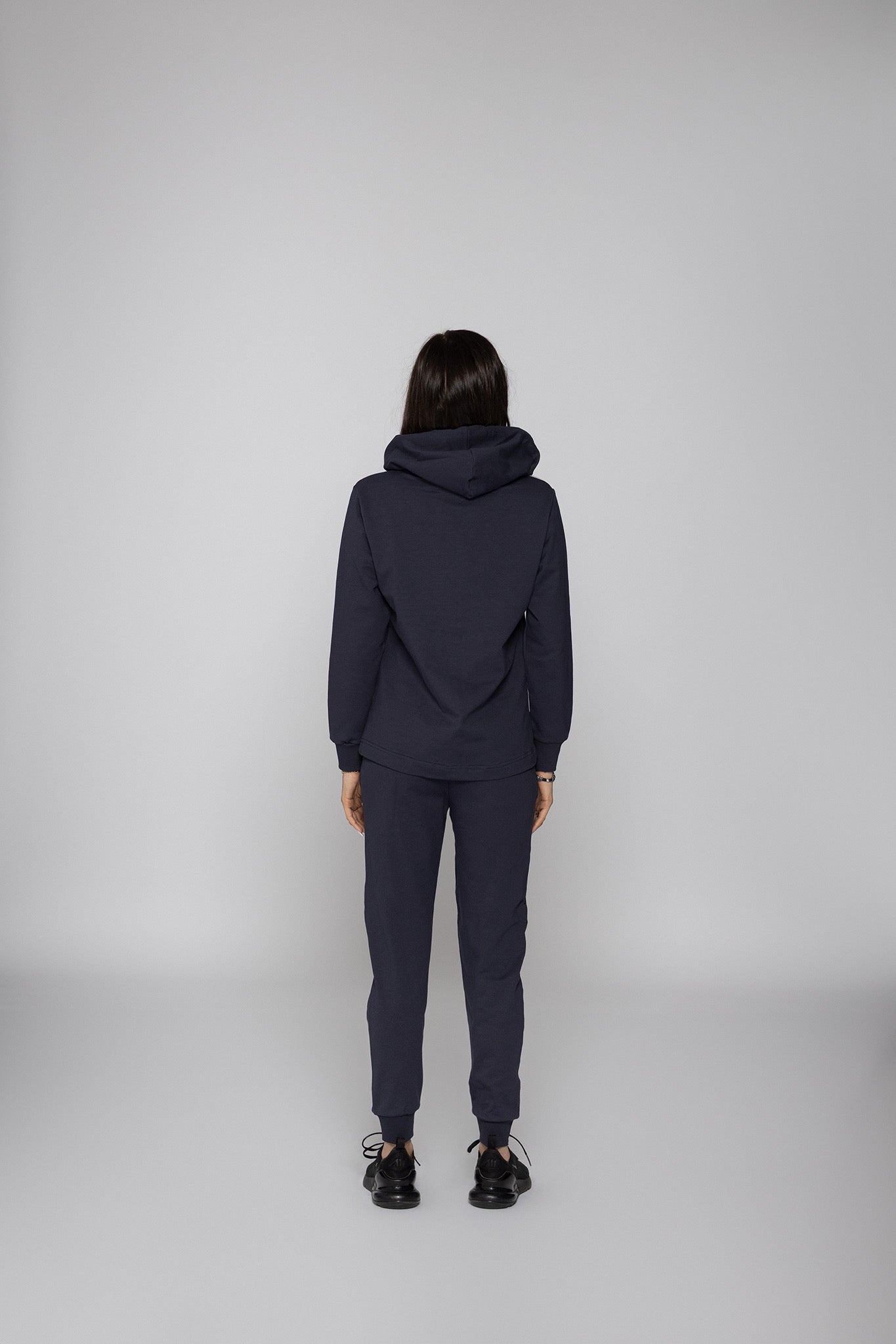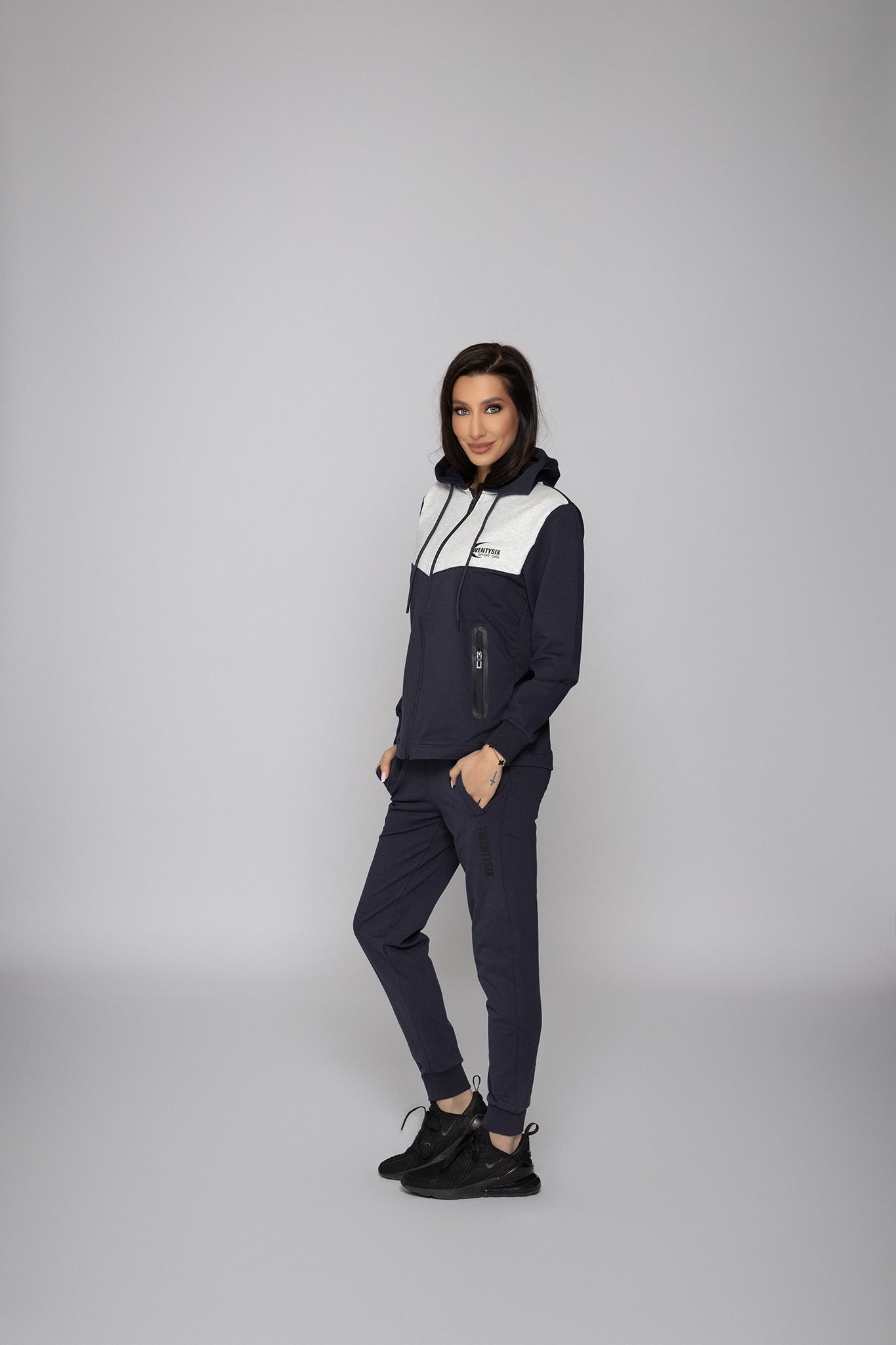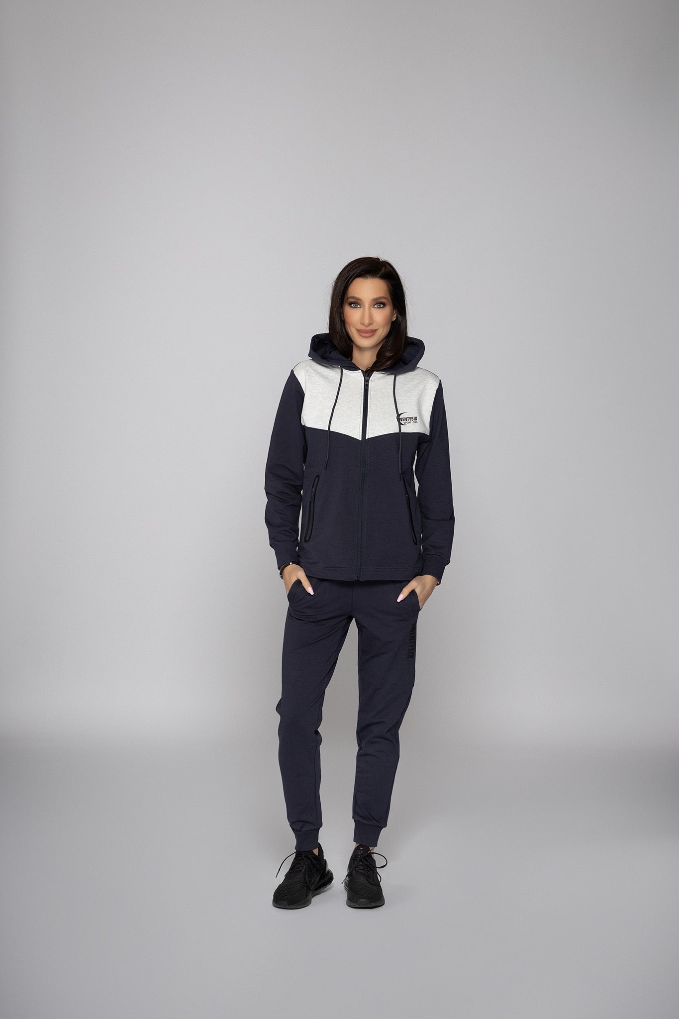 Комплектът включва удобно горнище с дълъг ръкав и долнище с еластична талия, които осигуряват свобода на движение и подчертават спортно-елегантния стил. Идеален е за ежедневие, разходки и спорт.