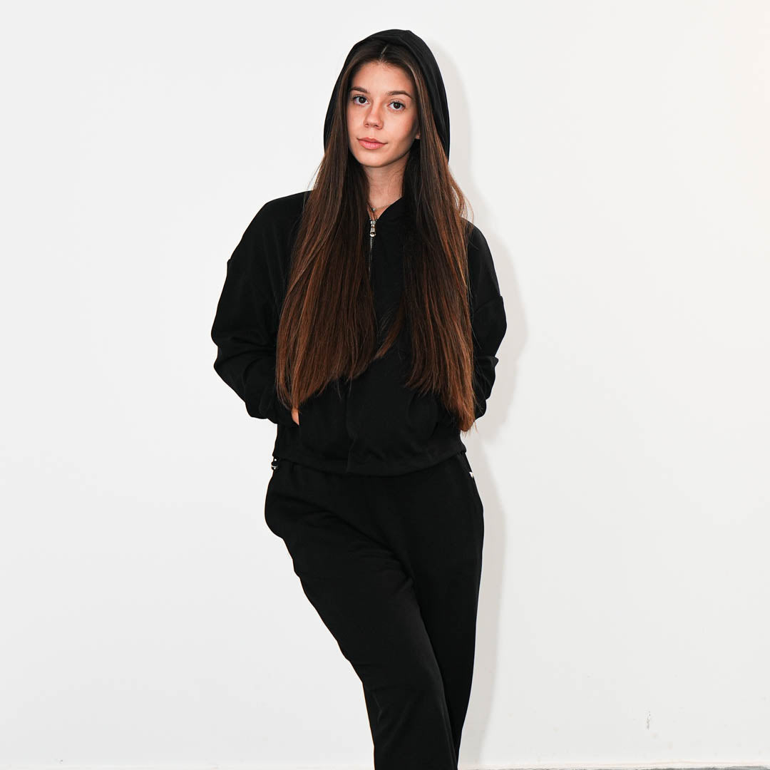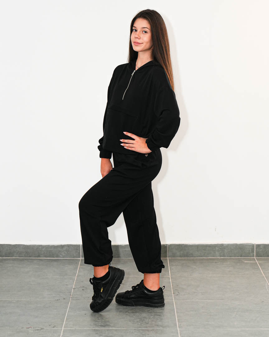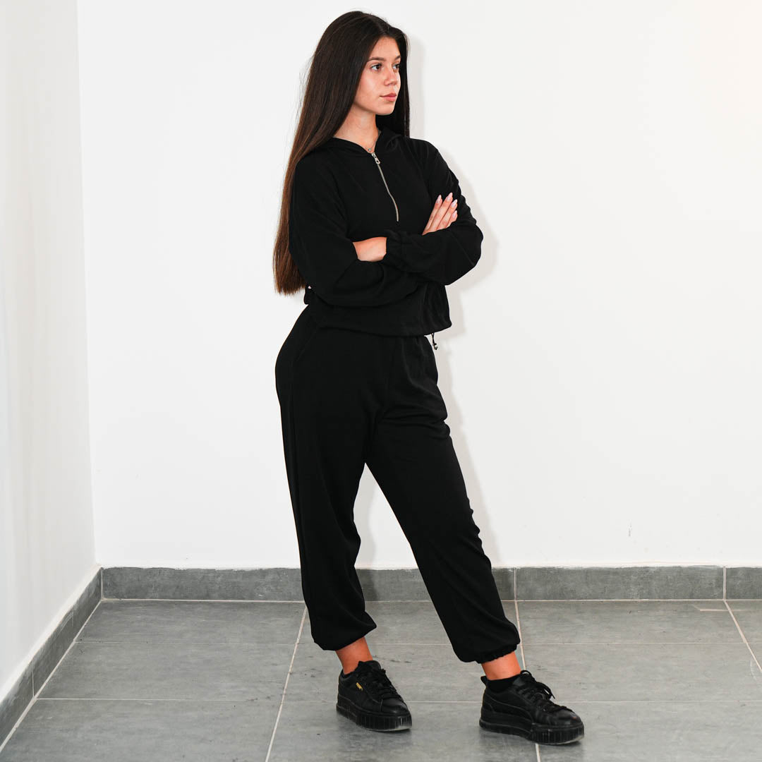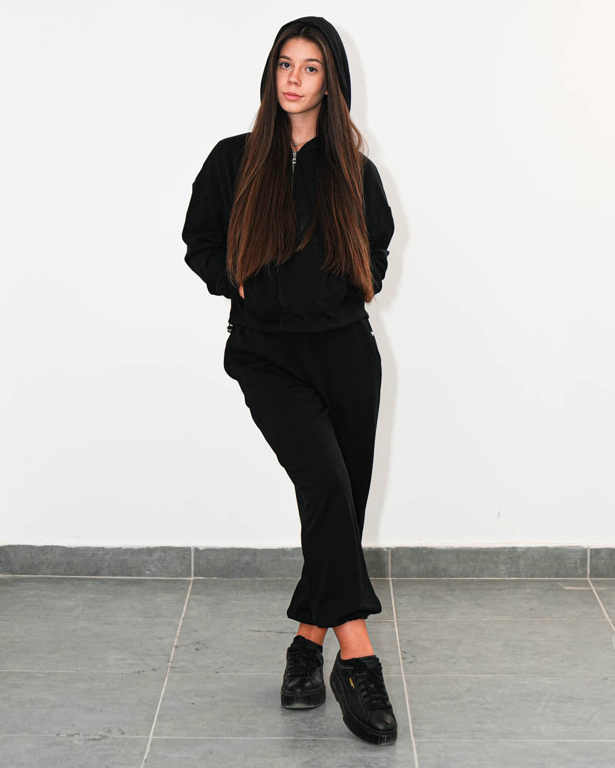 Комплектът включва горнище с джобове и качулка и панталон с перфектна кройка, които подчертават женствената фигура, като същевременно осигуряват свобода на движение.