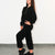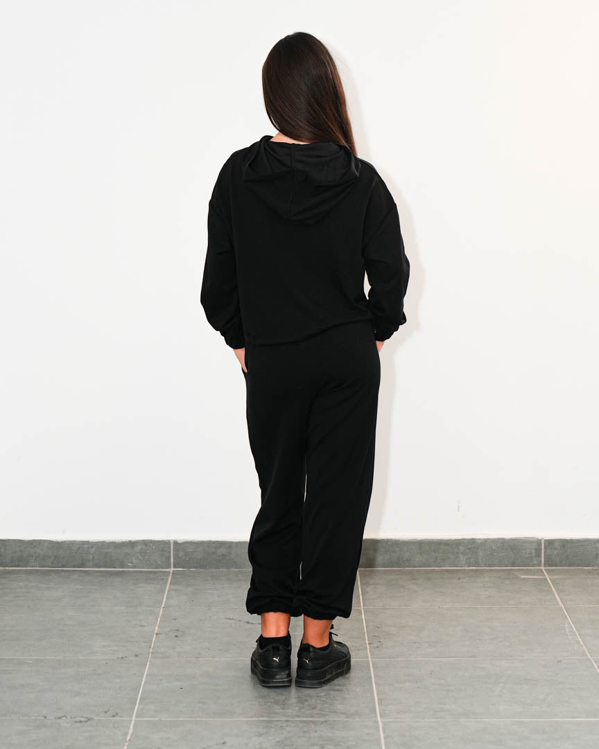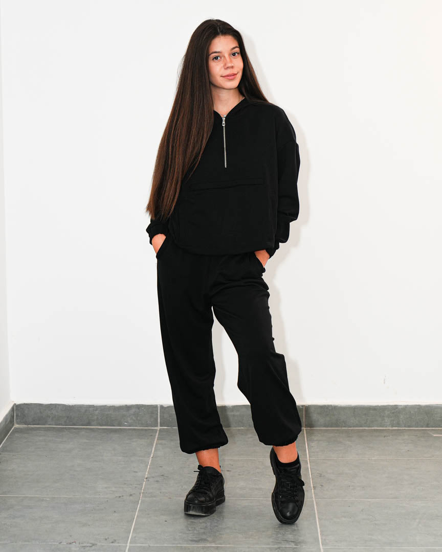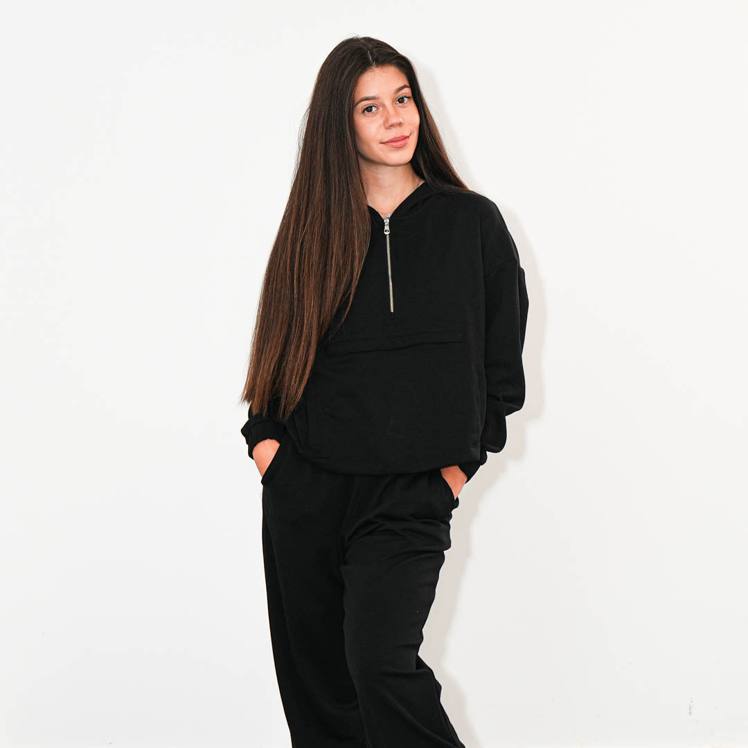 Комплектът включва горнище с джобове и качулка и панталон с перфектна кройка, които подчертават женствената фигура, като същевременно осигуряват свобода на движение.