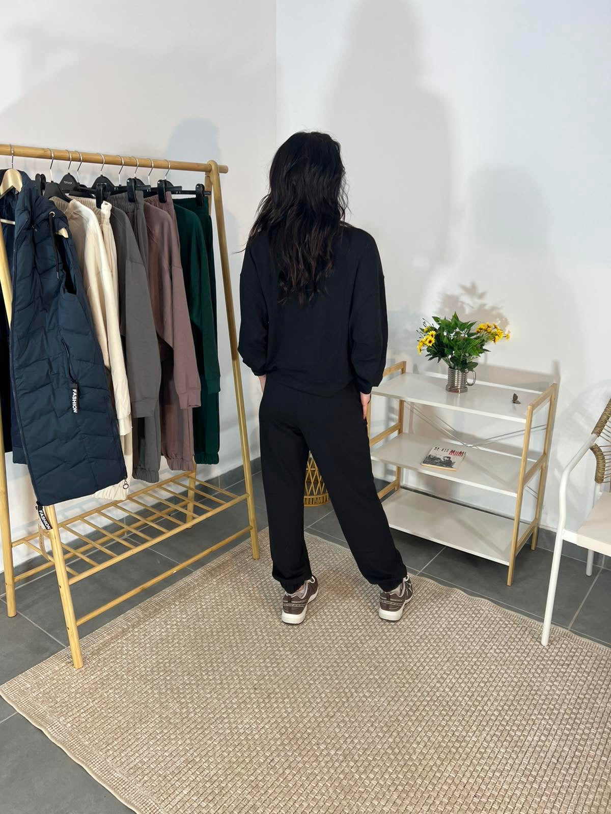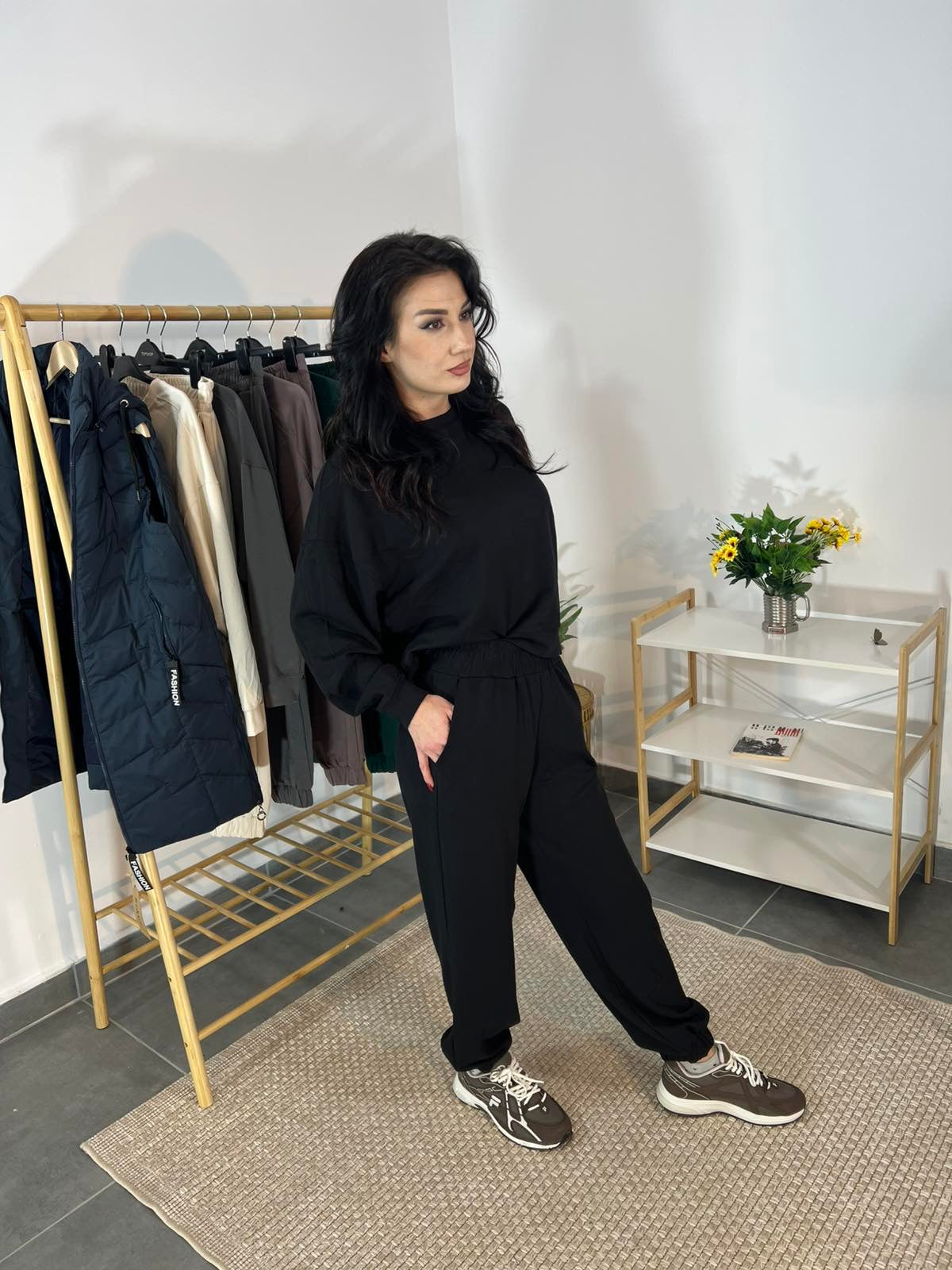 Горнището с обло деколте и изчистена линия придава елегантен силует, а панталонът със съвършена кройка осигурява свобода на движение и удобство. Това е комплект, който ще обикнете – подходящ както за разходки, така и за ежедневни срещи или уют у дома.