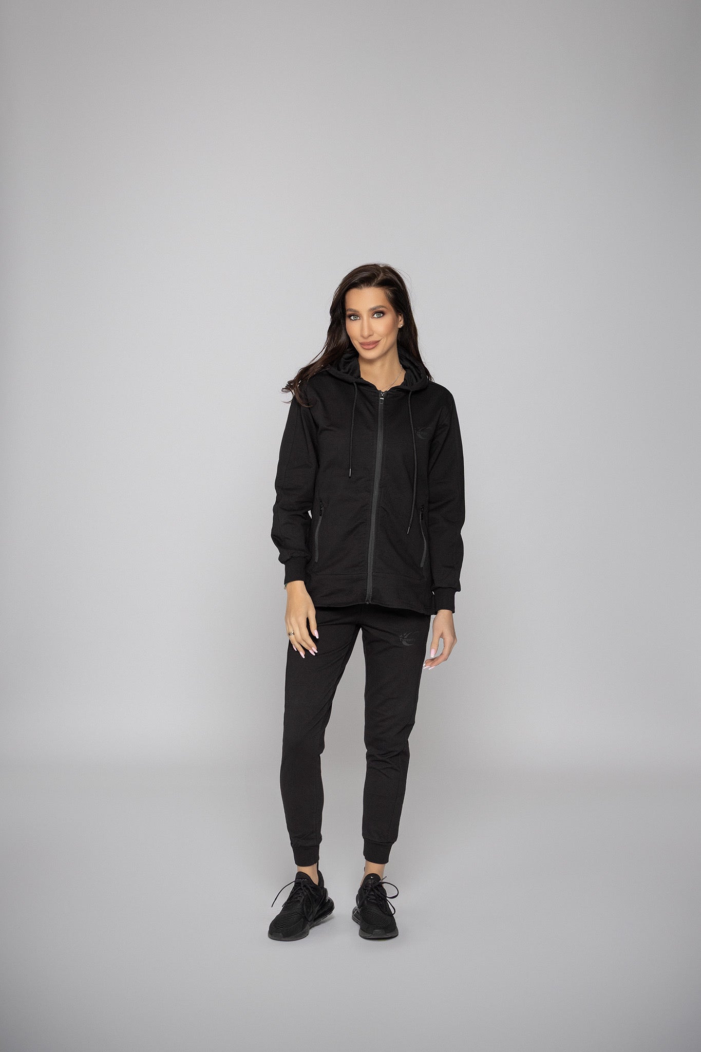 Комплектът включва удобно горнище с дълъг ръкав и долнище с еластична талия, които осигуряват свобода на движение и подчертават спортно-елегантния стил. Идеален е за ежедневие, разходки и спорт.